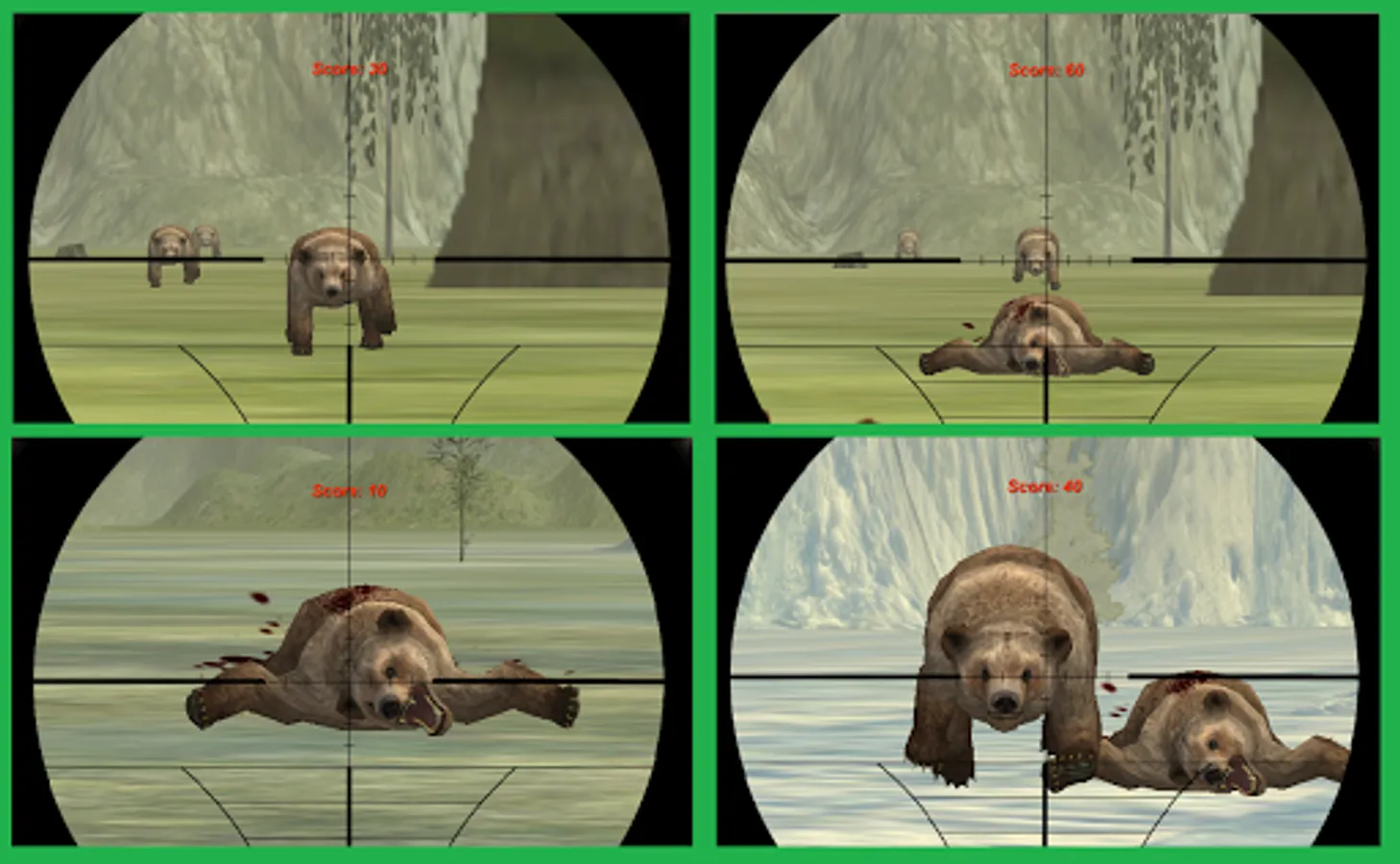 To get high score you have to hunt more 35 bears within shortest time. And, to hunt more bears you need best and accurate firing skills, focus on the object, make a quick and sharp decision in this action game. You need best sniper shooting skills in jungles.