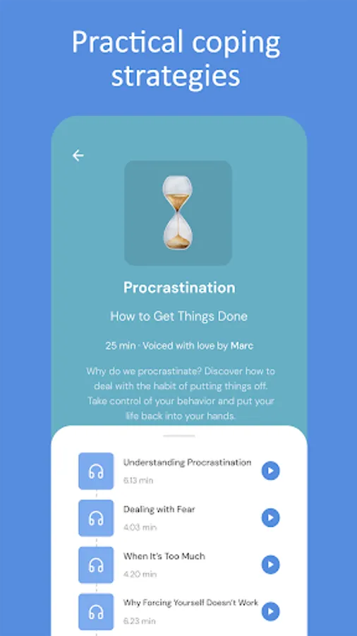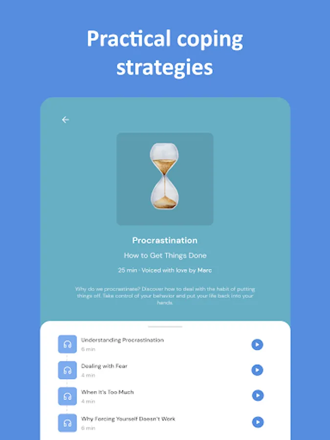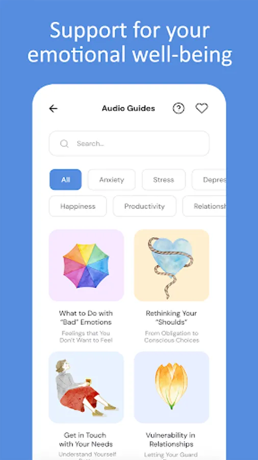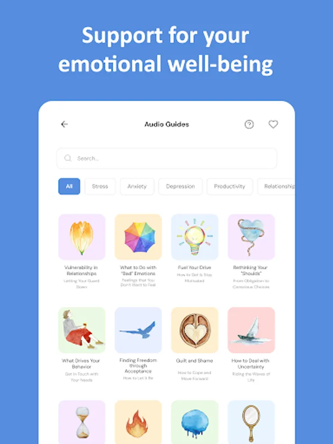🎧 Audio Guides: Insightful and practical podcasts that offer a helpful perspective and strategies on various emotional well-being issues, including anxiety, stress, challenging emotions, self-care, happiness, self-esteem, self-compassion, relationships, trauma, depression, and more.