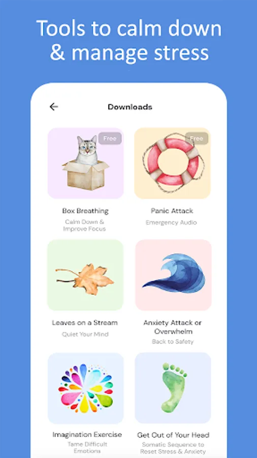 🍃 De-Stress Exercises: Self-help tools for anxiety relief, coping with stress, panic attacks, and difficult feelings. These techniques include grounding and relaxation exercises, breathwork, mindfulness and somatic practices, and other methods from empirically-supported treatments.
