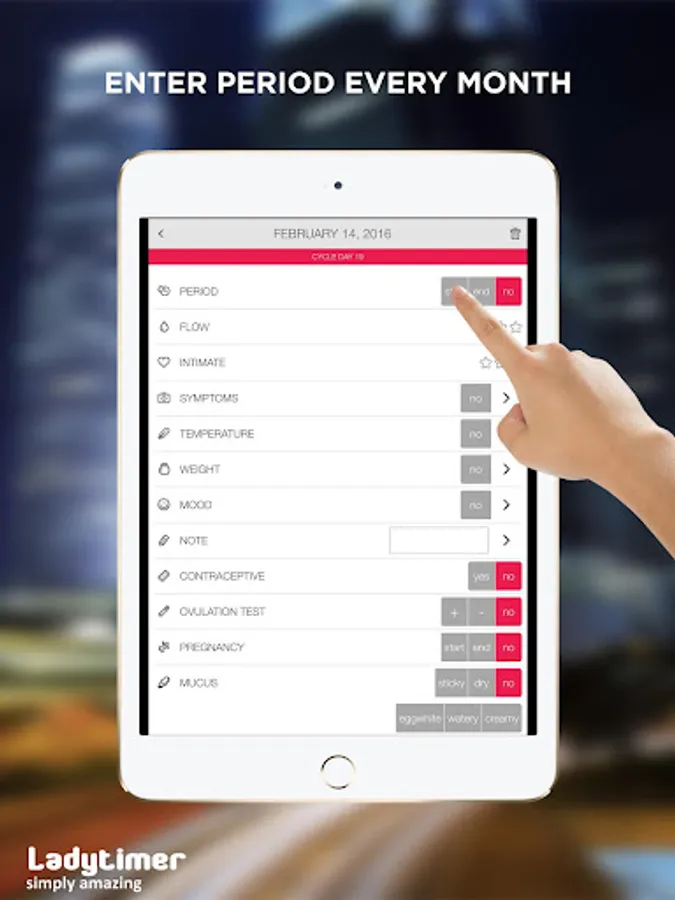 Enter and track symptoms, moods, notes, weight, intimacy, ovulation tests, birth control pills, etc for any day. Chat with other Ladytimer app users.