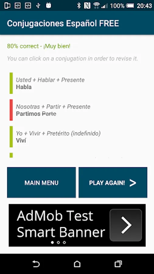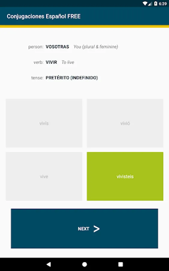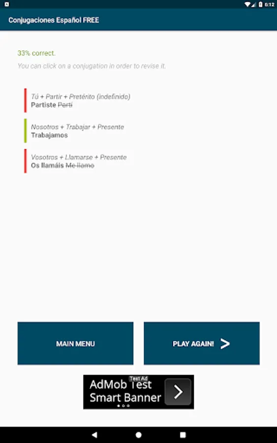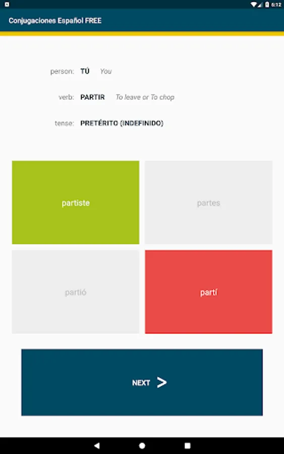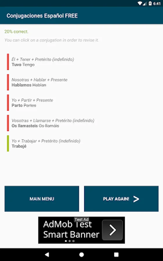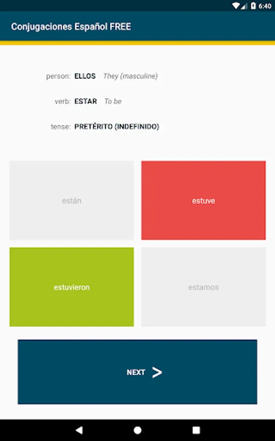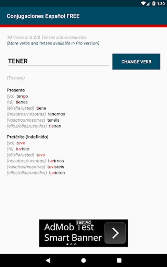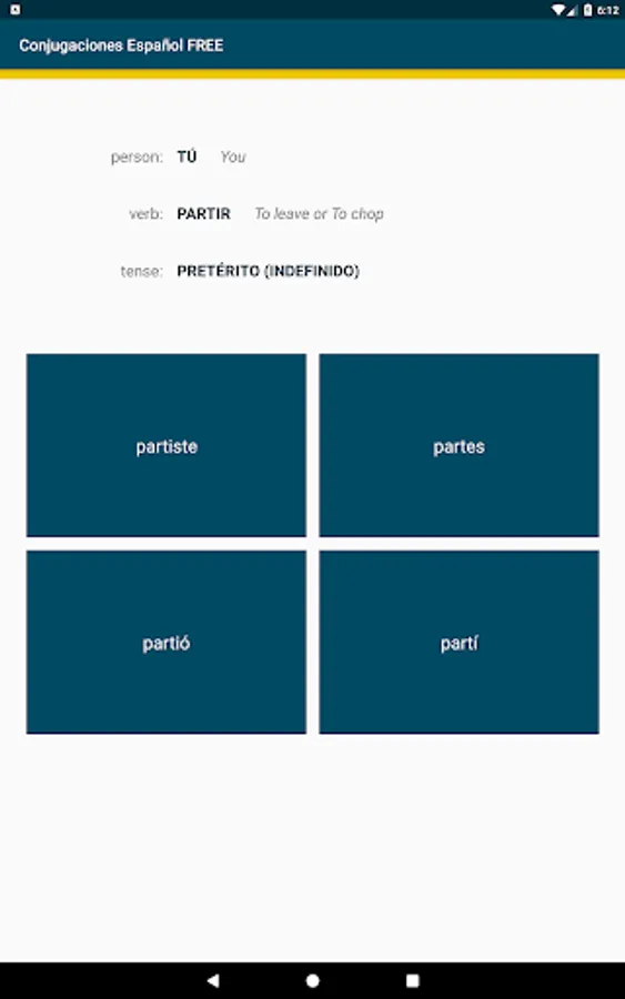A handy way to revise your Spanish verb conjugations and tenses, including a quick game to help you practice. Can be used on the go, even without data (once you install, you don't need an internet connection).