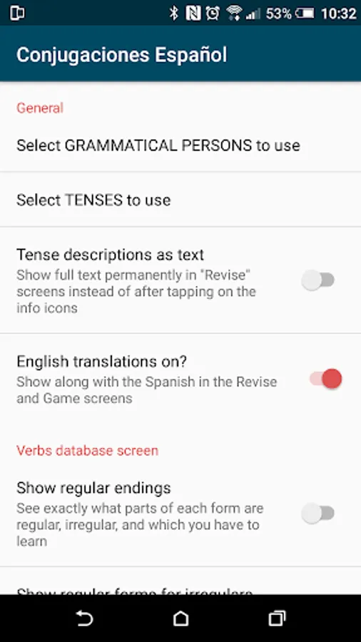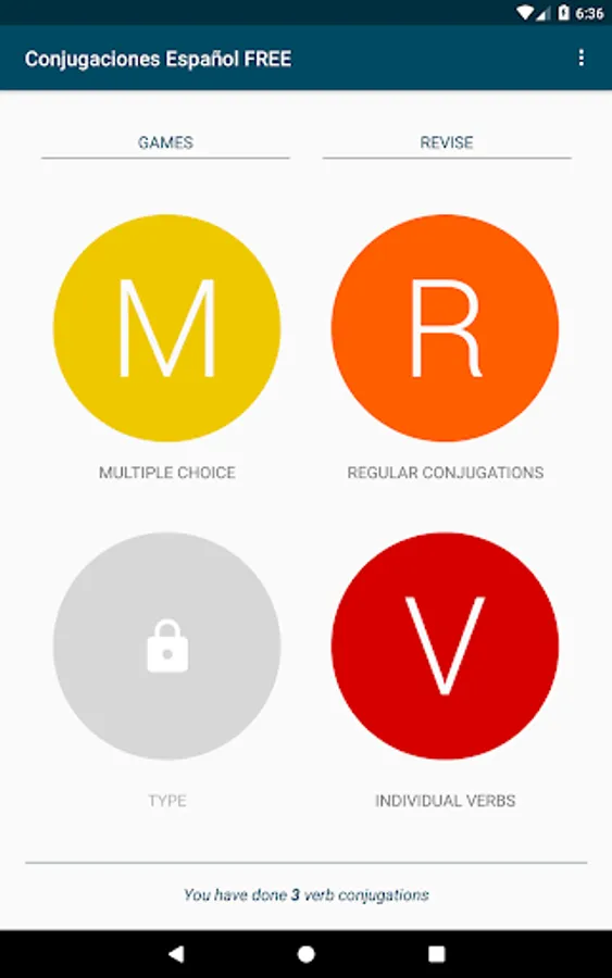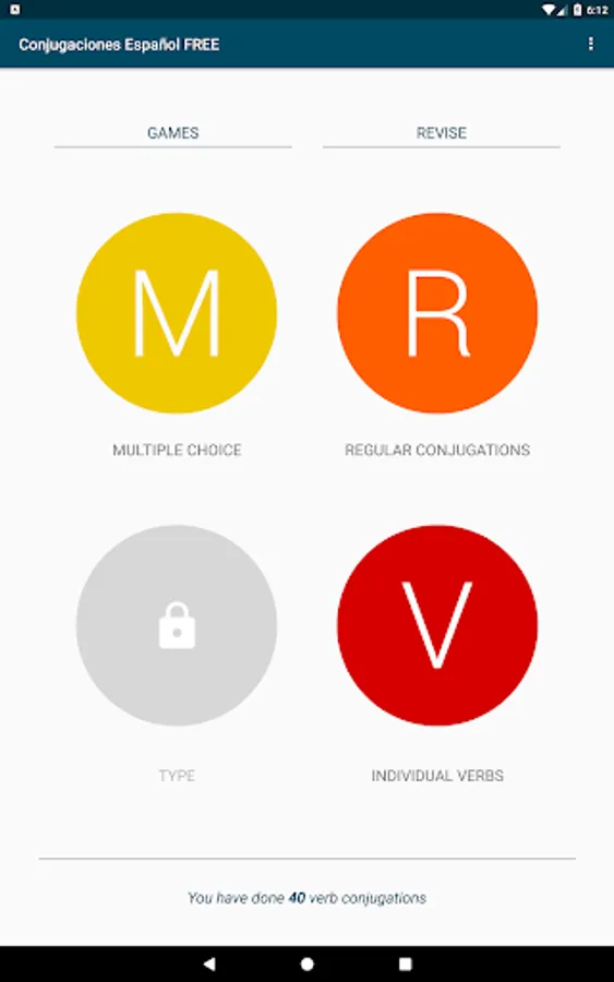 -100 verbs in free version, including irregulars and reflexives (1000 in the paid version).