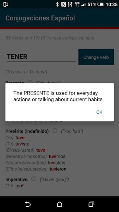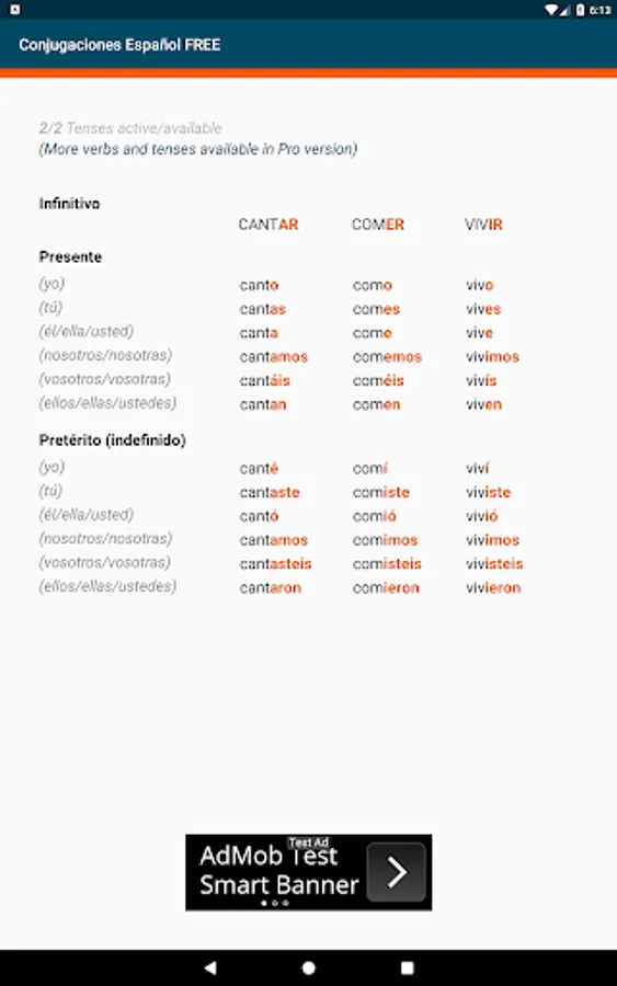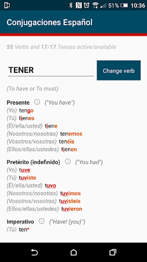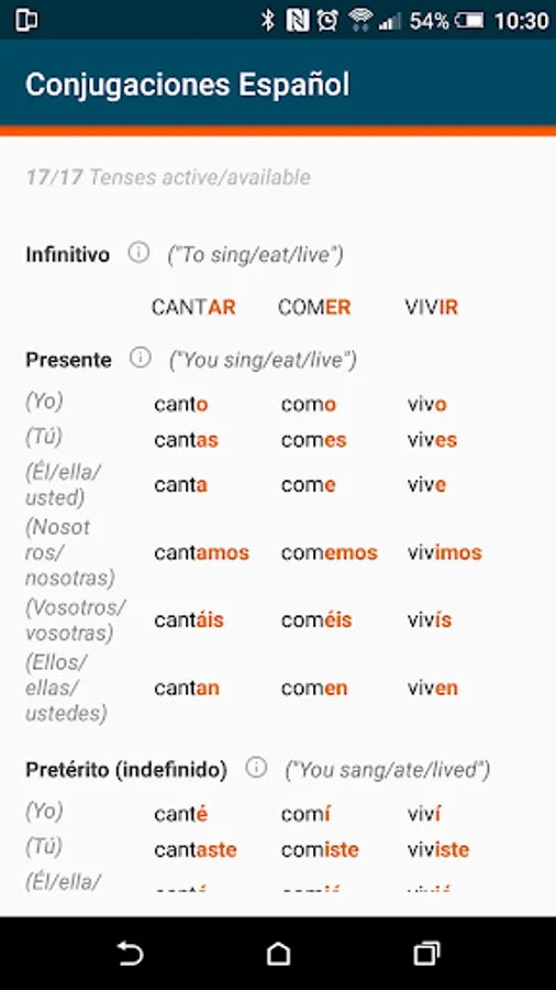 -3 tenses: "Presente", "Pasado" (pretérito indefinido) and "Imperativo". Select/deselect which you want to use. Includes brief explanation of use (all 17 in paid version, including "Imperativo negativo").