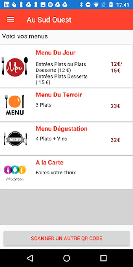 Even if the QR Code was not generated with ScanMenu, the application will display the menu. Record your dishes to keep a history of your restaurant meals.