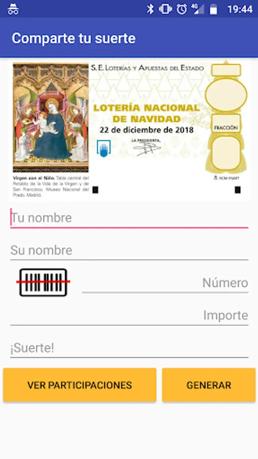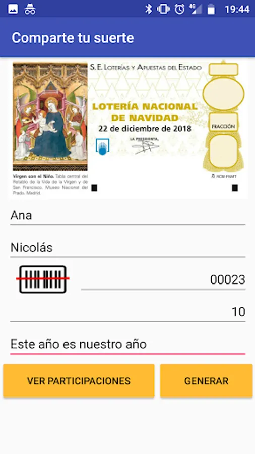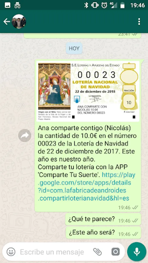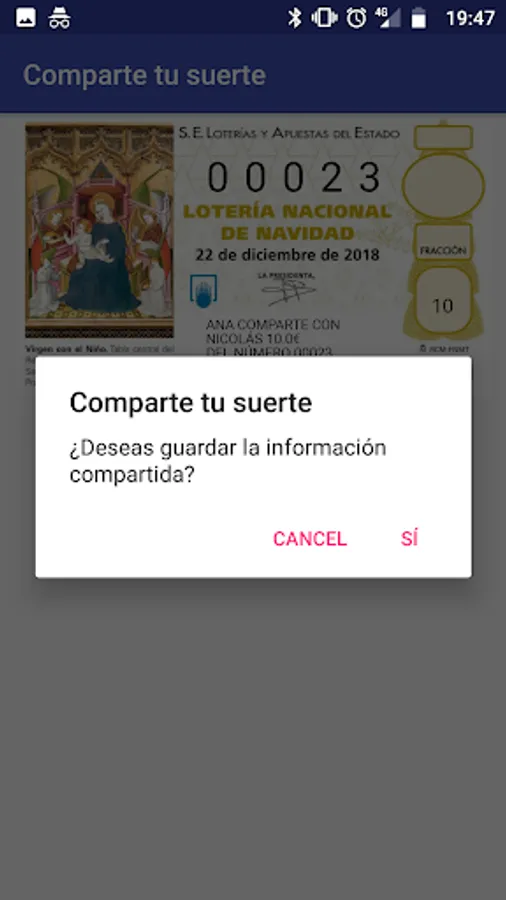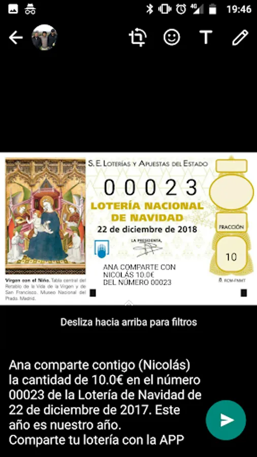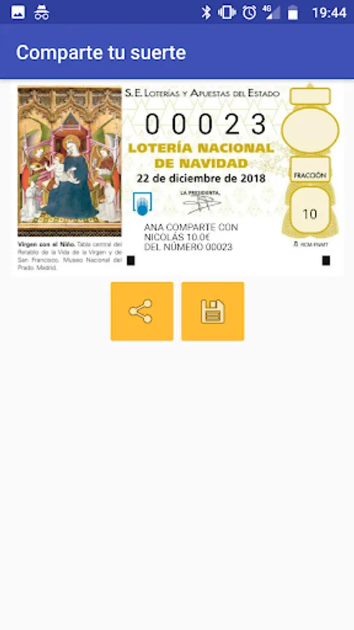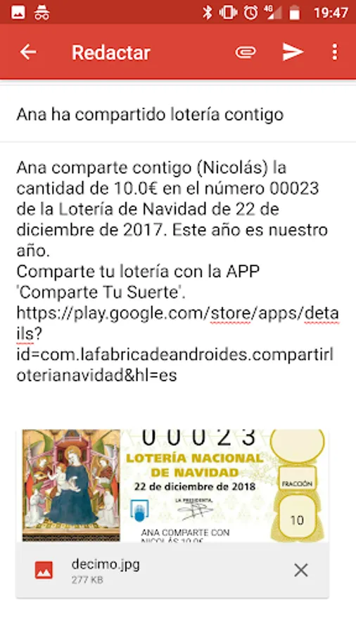 'Share your luck' allows you to inform the people with whom you share your 2019 Christmas Lottery numbers in a simple way, through WhatsApp or GMail for example. Sharing Christmas Lottery is very easy with 'Share your luck!