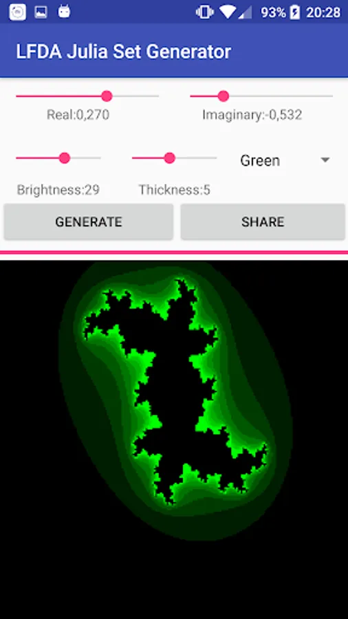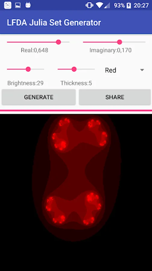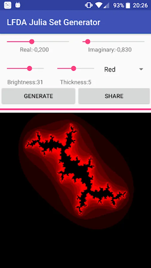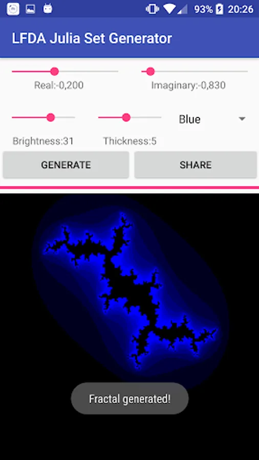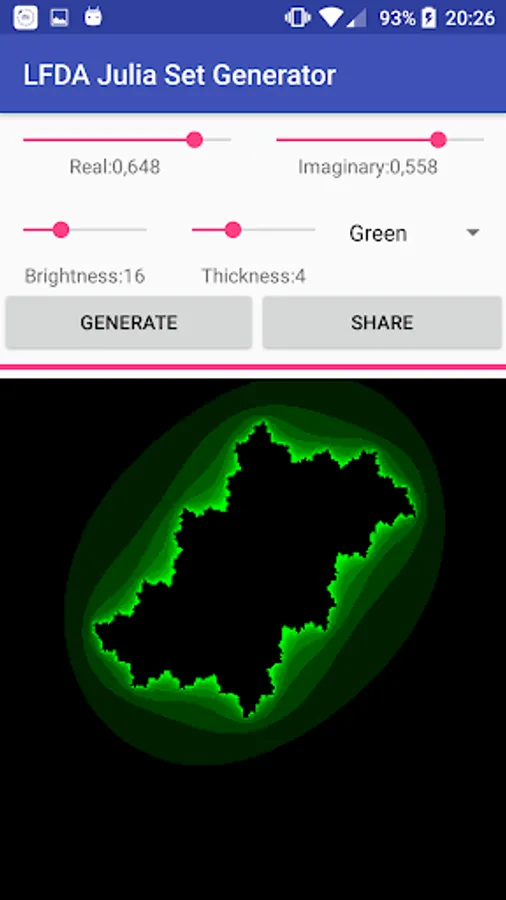 Create and share fractals with Fractal Generator LFDA Julia in September. Select the complex utililizar number, thickness point, brightness and color. Fractal Share with your contacts.