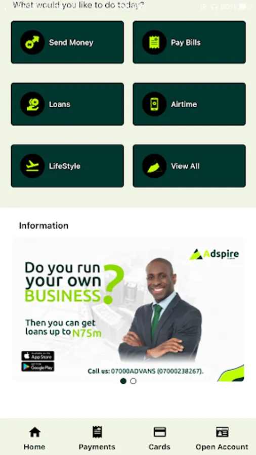 If you want to perform larger transactions or if you need support on Adspire by Advans Mobile, call Advans La Fayette Microfinance Bank customer service on 07000238267 or go to a branch.