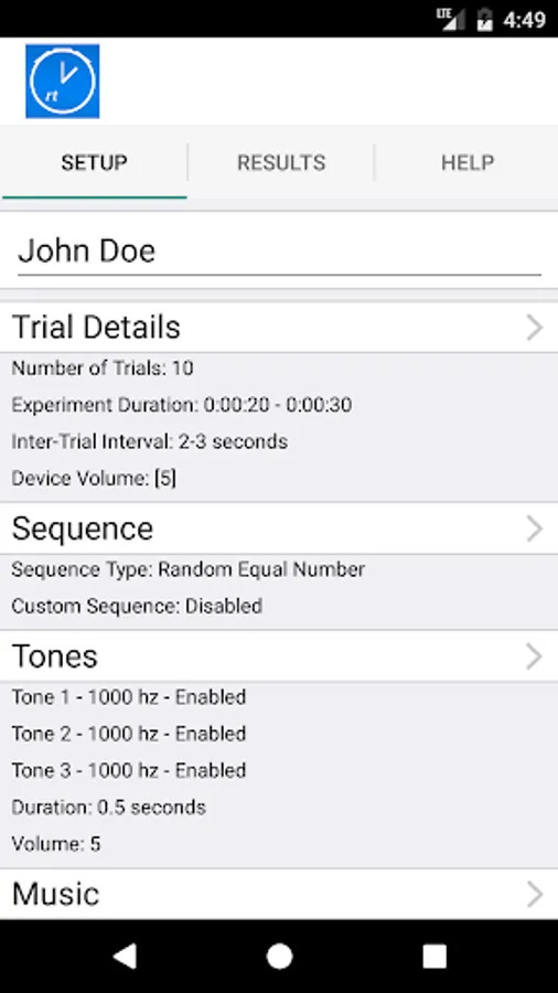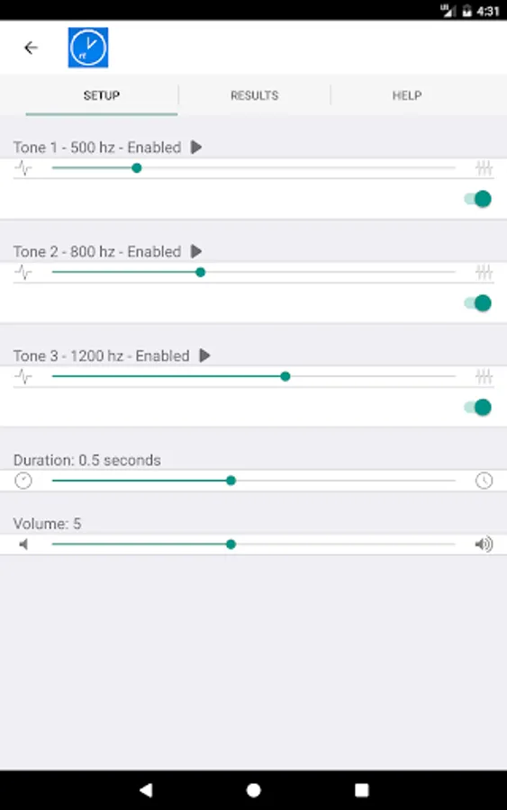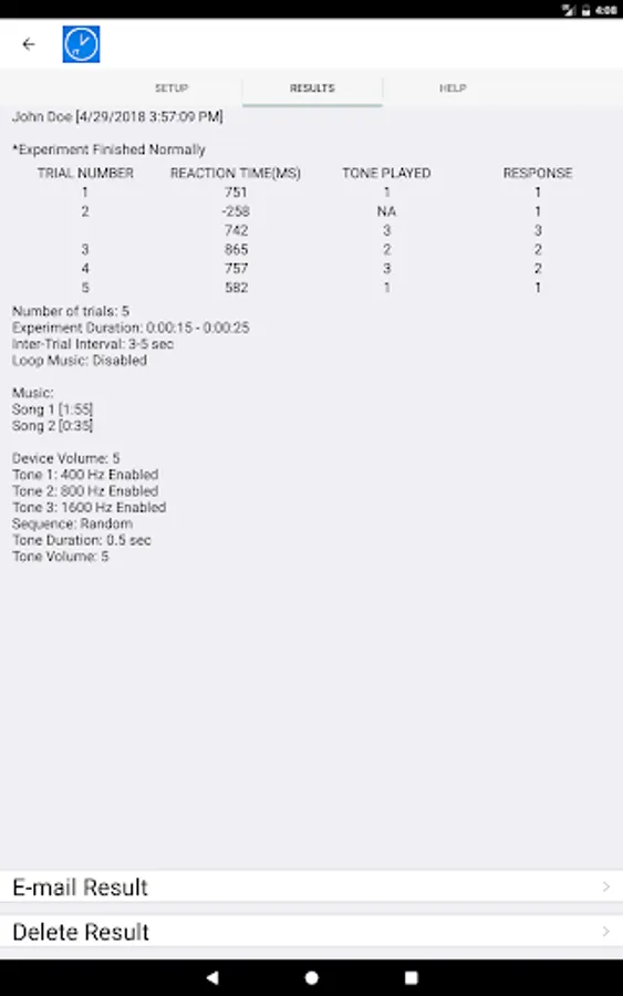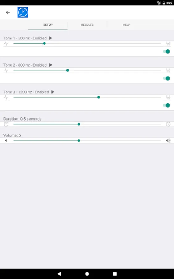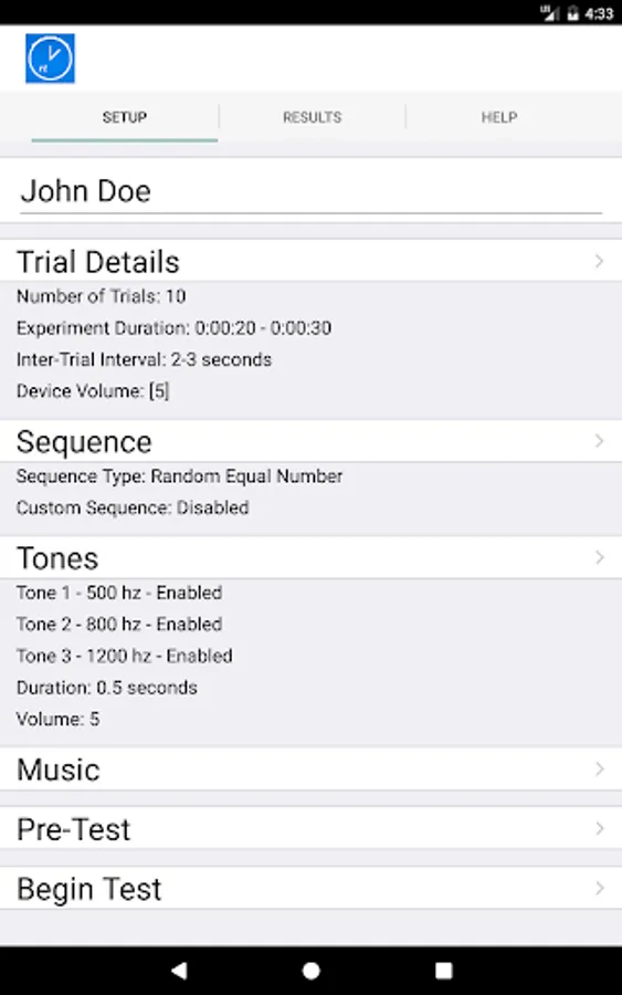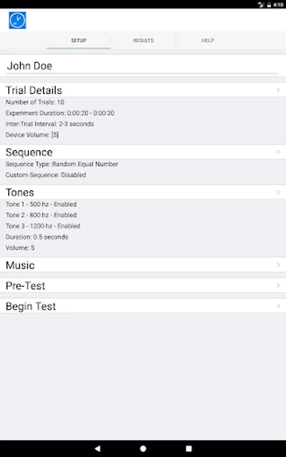 This application measures response times of the listener to a tone stimulus over background noise or music. The tone and background noise or music are user defined and have independent volume controls. Listeners must acknowledge hearing the tone by touching the screen in response. The subsequent results are reaction times to the stimulus. These reaction times can be used as an evaluation measure for both divided and selective attention.