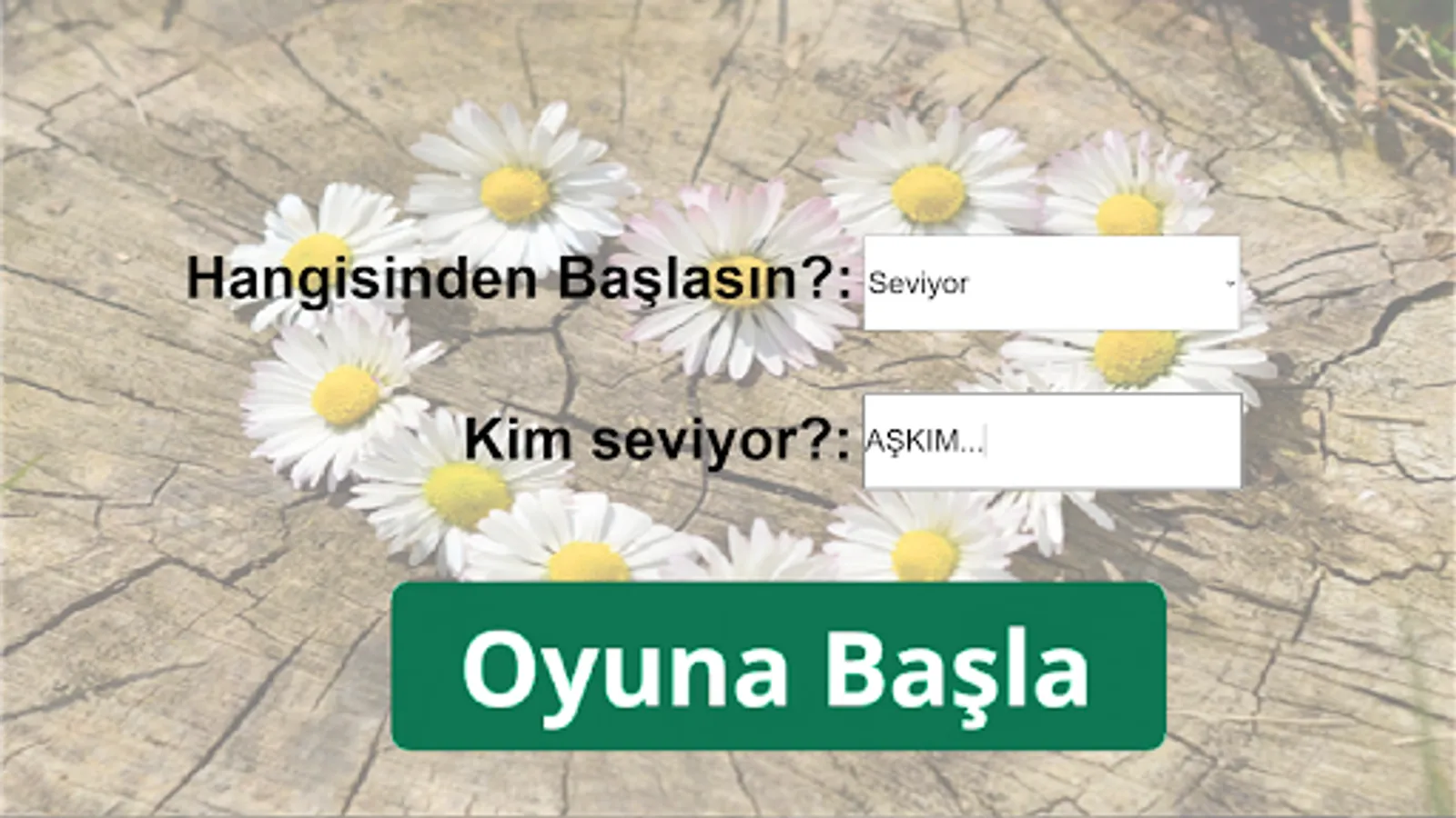 Find out if your loved one loves you or doesn't like you with the love or not love test game. Even if the results you find do not reflect the reality, they will make you entertain the game. You will also enjoy playing the love game. These love games are purely for entertainment purposes. If you feel bored, this love counter game is for you. Press the start game button to start the game. Then you'll come across a daisy with a random number of leaves. As you click on the leaves of the chamomile, the chamomile leaf will break. In doing so, you choose whether you want to start with or not. The result will vary with the number of leaves. You can download this game to play Turkish love games.