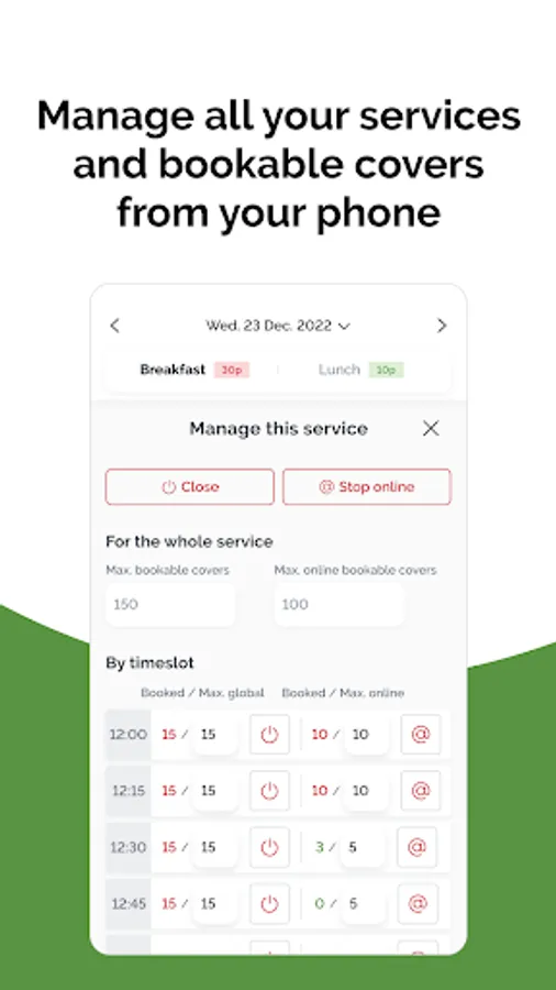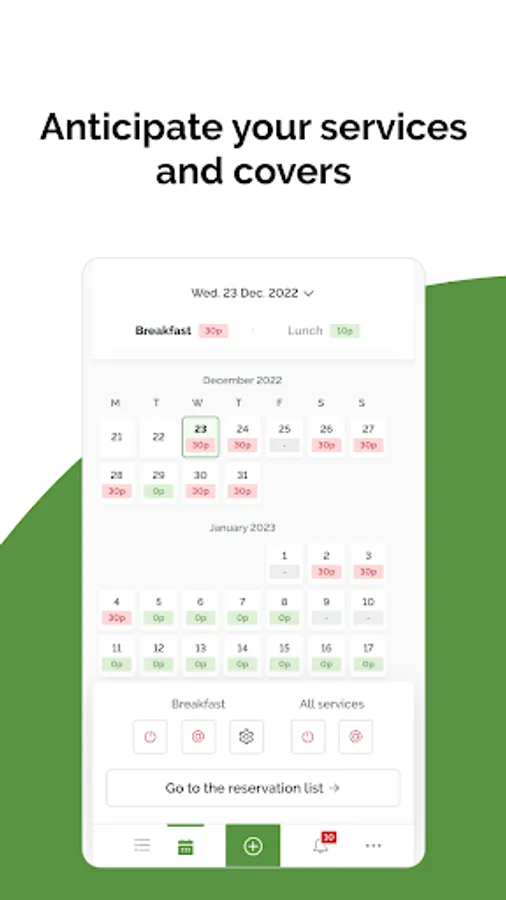 Get quick access to the management of your availabilities by services. Open, close or edit the number of your bookable covers. Visualize at first sight all your bookings for 4 weeks with the calendar view.