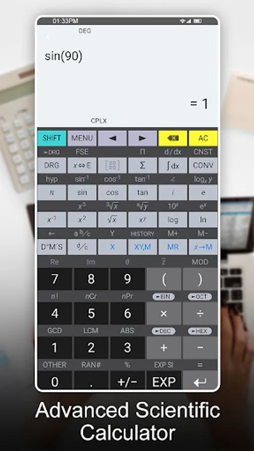 A calculator that can solve arithmetic calculations using functions like permutation and combinations. The scientific calculator also supports logarithm, exponential, and modulus calculations. Advanced Scientific Calculator is a mobile calculator that looks and functions just like a conventional one.