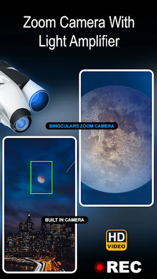 Mega Binoculars Photo Video is a tool for magnifying and enhancing light. Its user-friendly and functional UI will make using it enjoyable. To get your photo, use the built-in zooming and light amplification tools, or shoot a video using the recording option and save it to the in-app gallery. Additionally, select one of the many effects to improve your image or video before sharing it with others.