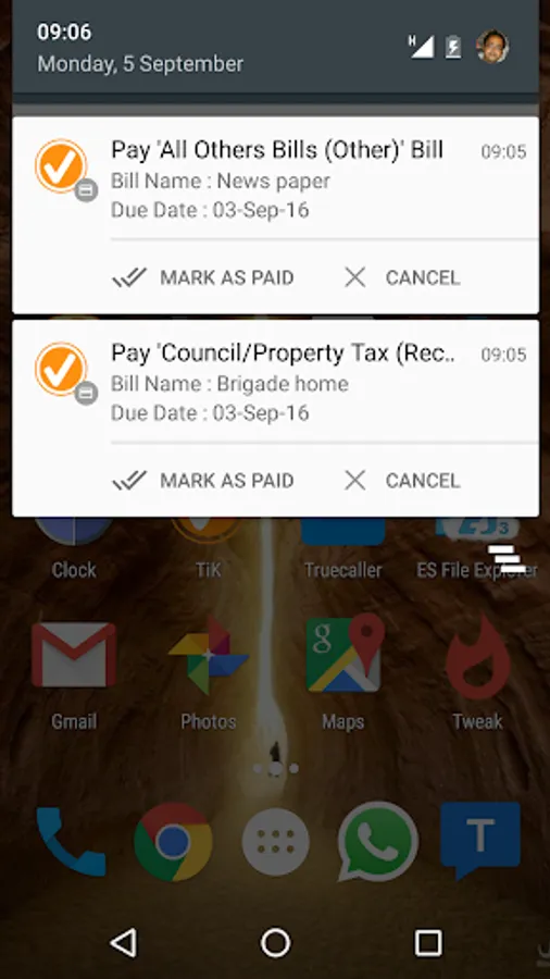 2. App will start sending friendly reminder 5 days (configurable) in advance at the set time of the day, configured by you. Reminders will be coming everyday till all the pending bills are marked as paid.