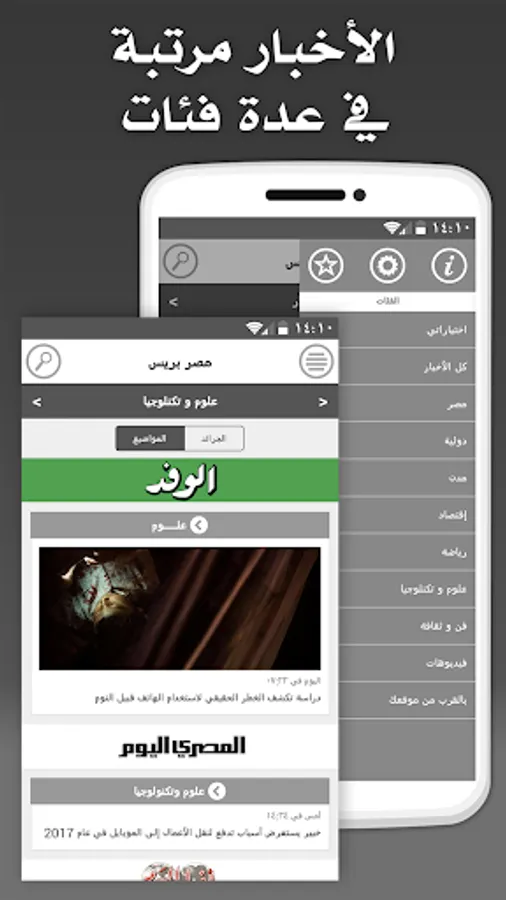 المقالات الإخبارية المعروضة مرتبة في عدة فئات : مصر، دولية، مدن، إقتصاد، رياضة، علوم و تكنولوجيا، فن و ثقافة، فيديو