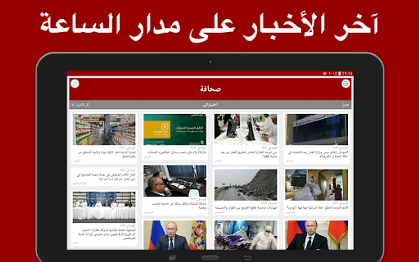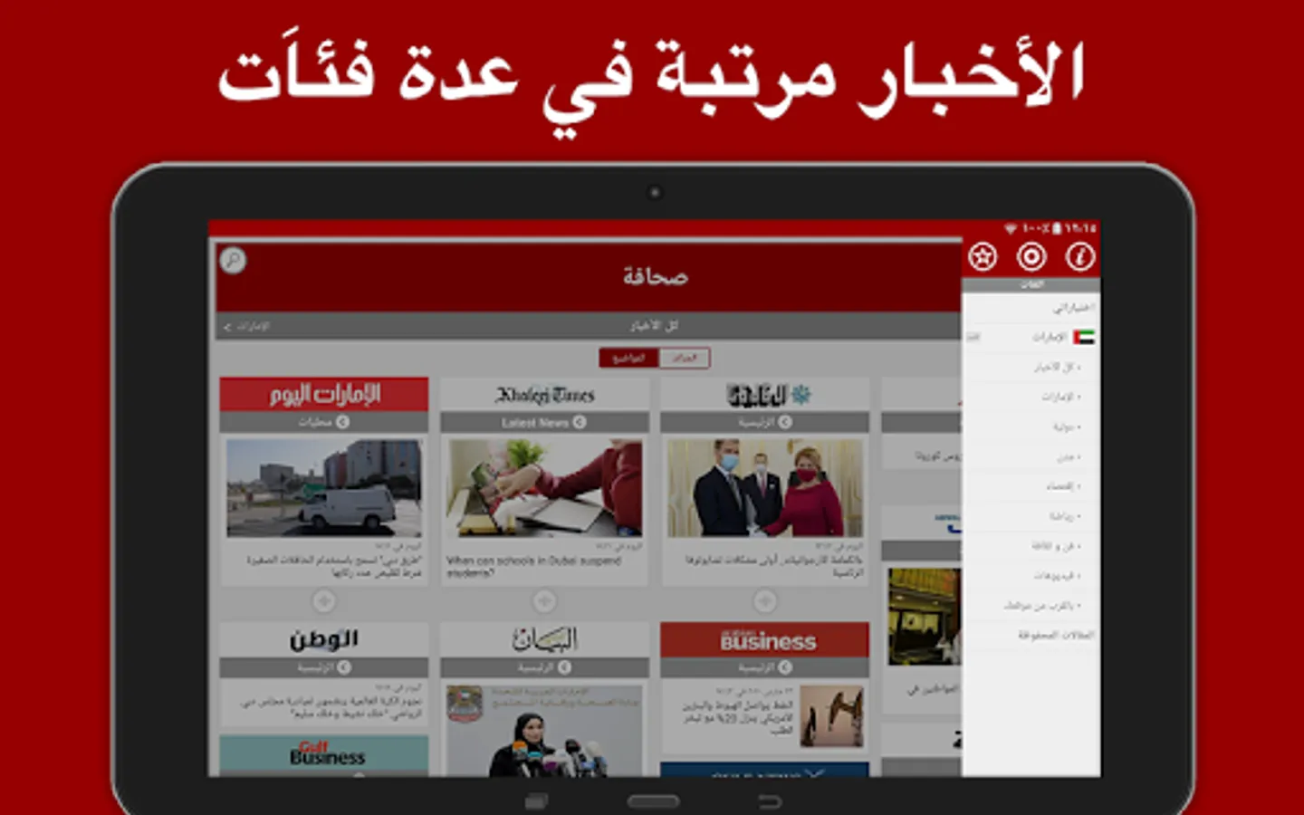 المقالات الإخبارية المعروضة مرتبة في عدة فئات : محلية، دولية، مدن، إقتصاد، رياضة، علوم و تكنولوجيا، فن و ثقافة، فيديو