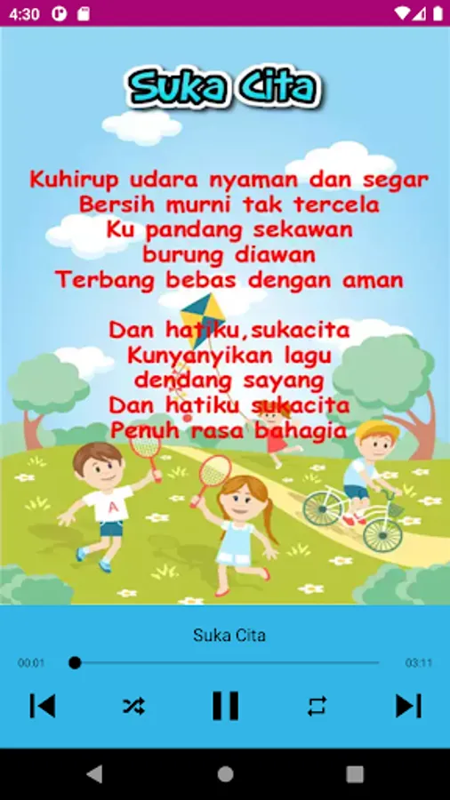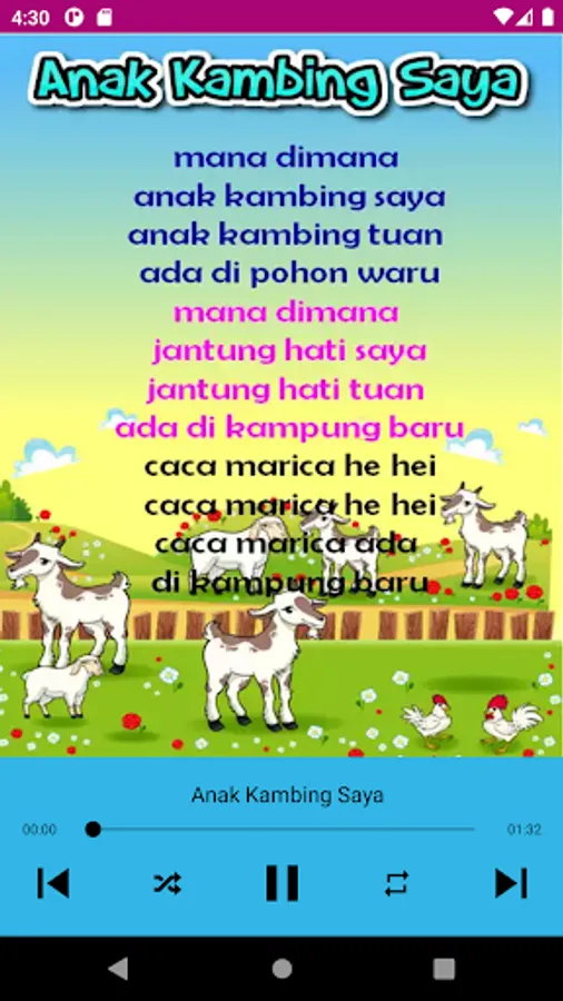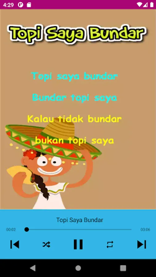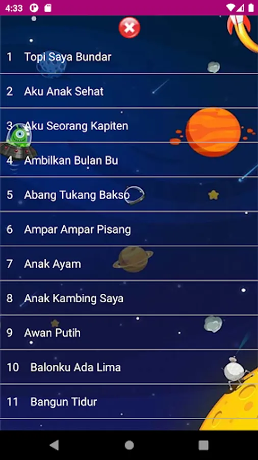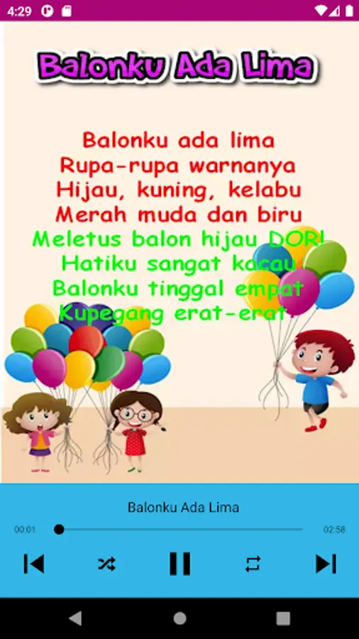 Dozens of Indonesian children's songs in one free application. Just one download and no internet connection needed to play songs.