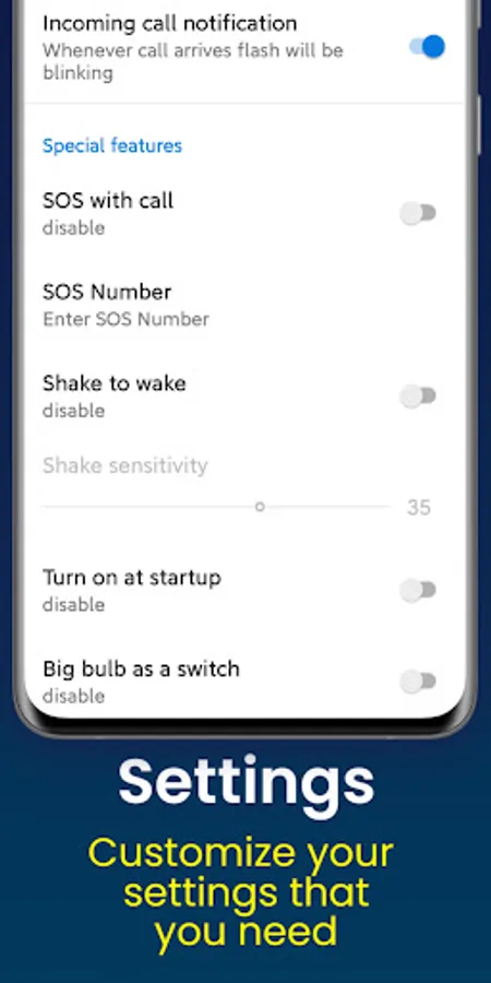 🆘 The flashlight app also supports SOS mode for emergency conditions where you can add a phone number for calling in an SOS situation and also the flashlight blinking.