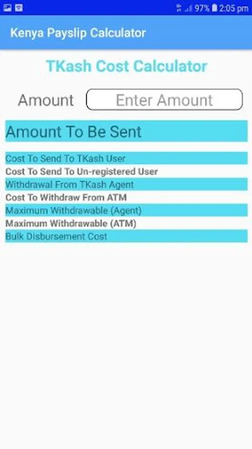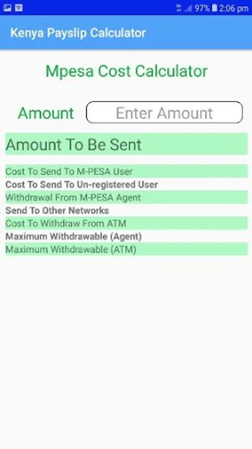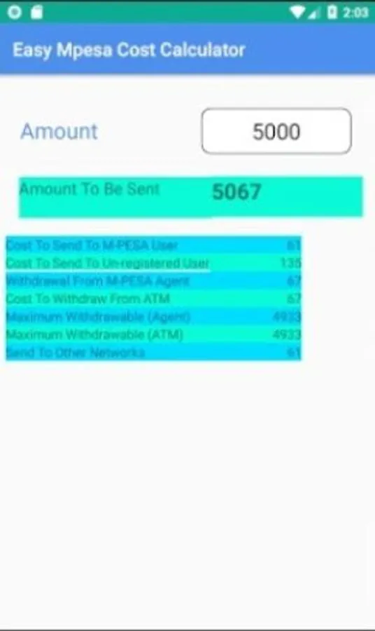 Welcome to the app that helps you determine how much to send to someone via the Safaricom M-PESA service at the touch of your phone screen. The rates used are the latest (2023) rates.