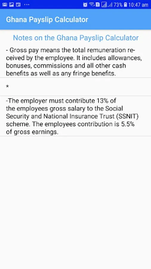 This app is meant as a guide for both employers and employees in calculating tax and other dues such as SSNIT contributions from both employers and employees.