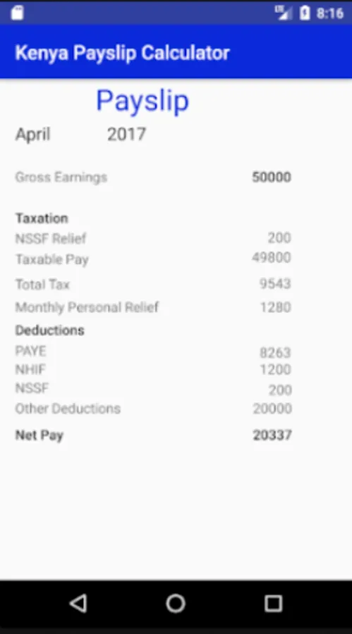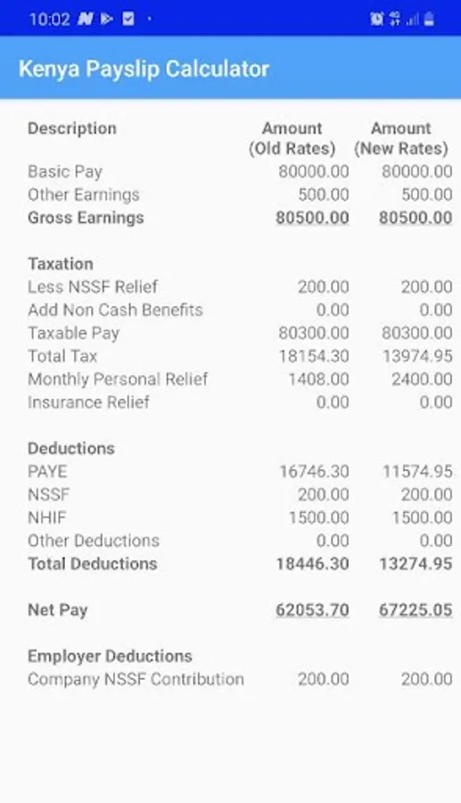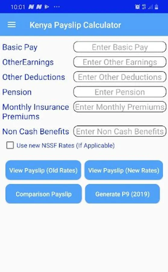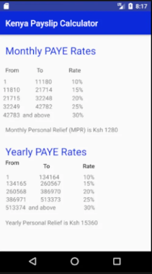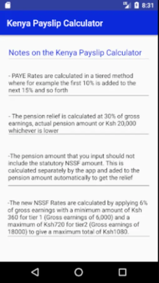 This app helps the user generate a payslip based on the new PAYE, NSSF and NHIF rates within the Kenyan payroll context. Simply key in your gross earnings, other earnings, insurance premium and any other deductions or pension contribution if applicable. The app then generates the payslip in pdf format which you can then share/email and print. The latest update contains the new PAYE Rates as from July 2023.