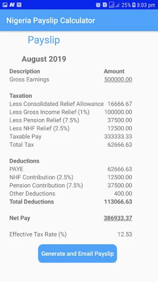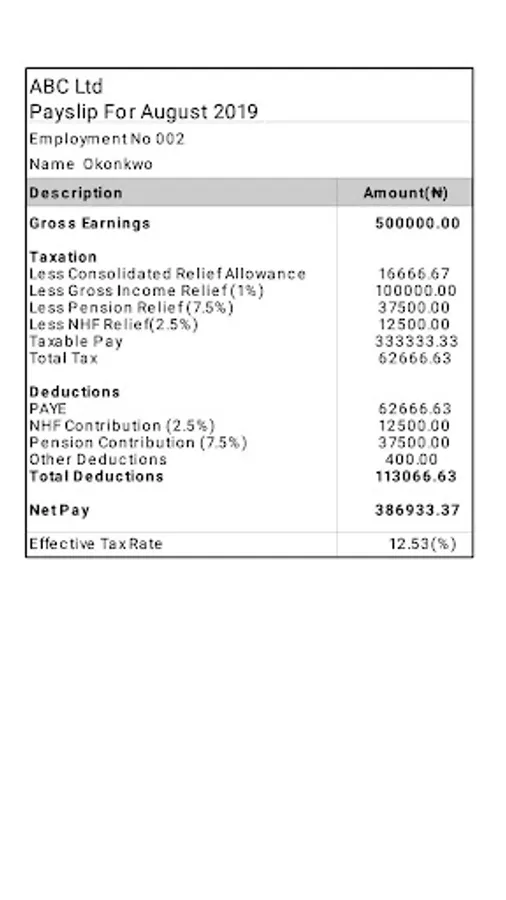 This app helps you generate and email/share a payslip in pdf format based on the latest Federal Inland Revenue Service (FIRS) tax rates.