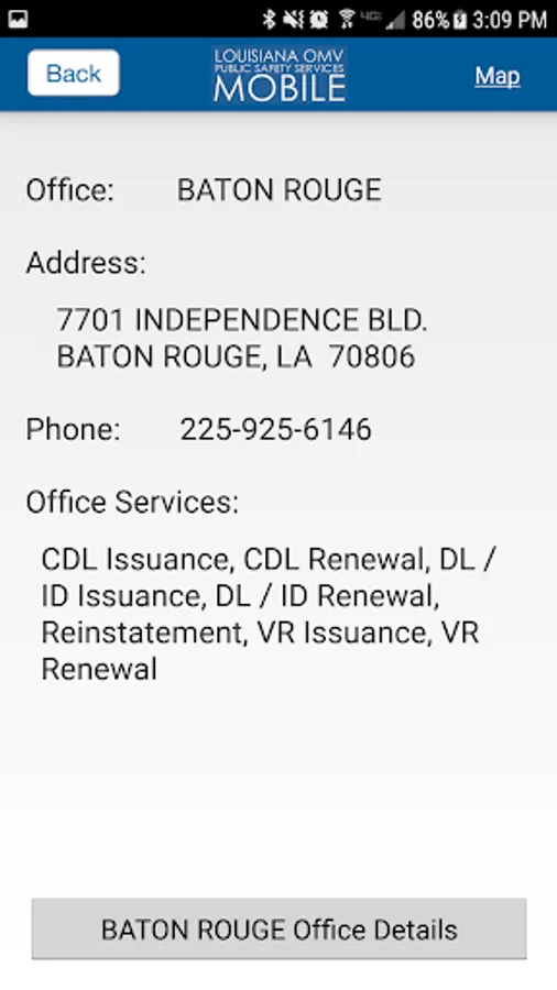No matter where you are in Louisiana, the app will provide the location and GPS navigation instructions to the nearest OMV office by using your current location.