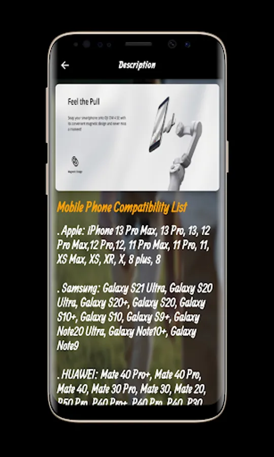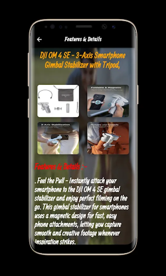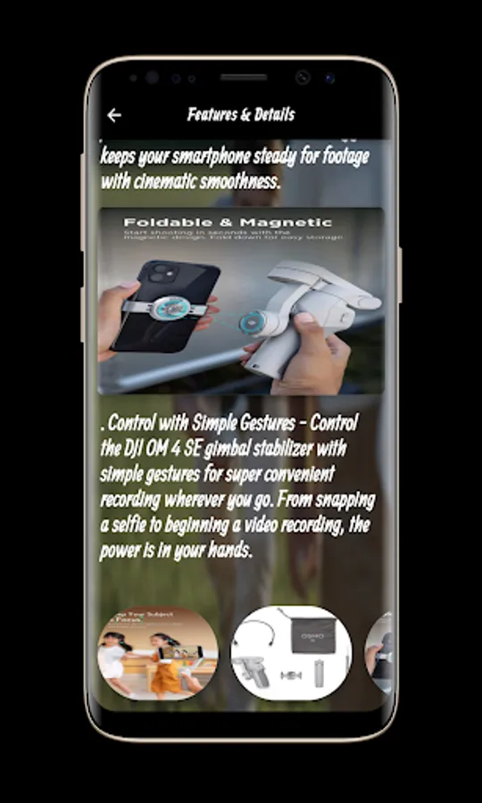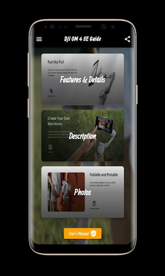The DJI OM 4 SE Guide application contains many information and features of the DJI OM 4 SE that you can get clearly and easily. Through the DJI OM 4 SE Guide application, you can watch a video of the DJI OM 4 SE, which allows Check out the look and feel of the DJI OM 4 SE Guide and its many different features including Feel the drag - instantly connect your smartphone to the DJI OM 4 SE gimbal stabilizer and enjoy perfect photography on the go. The gimbal mount for smartphones uses a magnetic design for quick and easy phone attachments, allowing you to take smooth, creative shots whenever inspiration comes.