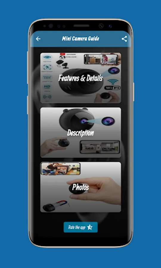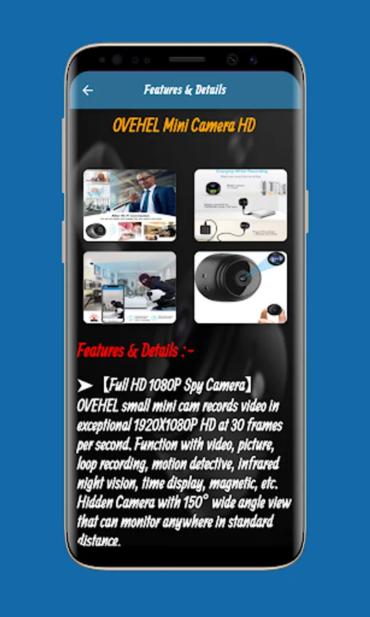 The Mini Camera Guide application contains many information and features of Mini Camera, which you can get clearly and easily. Through the Mini Camera Guide application, you can watch a video of Mini Camera, which gives you the opportunity to see the appearance and features The Mini Camera Guide has many different features including Full HD 1080P Spy Camera OVEHEL Mini Camera that records 1920X1080P HD video at 30 frames per second. Function with video, photo, loop recording, motion investigator
