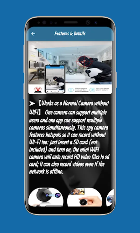 You can also now, through the Mini Camera Guide application, obtain a manual for using the Mini Camera, which you can view through the application, which provides you with a clear and easy way to learn how to use the Mini Camera. You can also see the product description, in which all The features and advantages of Mini Camera Guide that make it distinct from other similar products in the same field, and these features include a built-in 250mAh battery as a mini WIFI camera, a built-in 250mAh battery, fully charged, can work about 40-60 minutes, you can also connect the camera to a USB charger (or power bank) to record 24/7 hours
