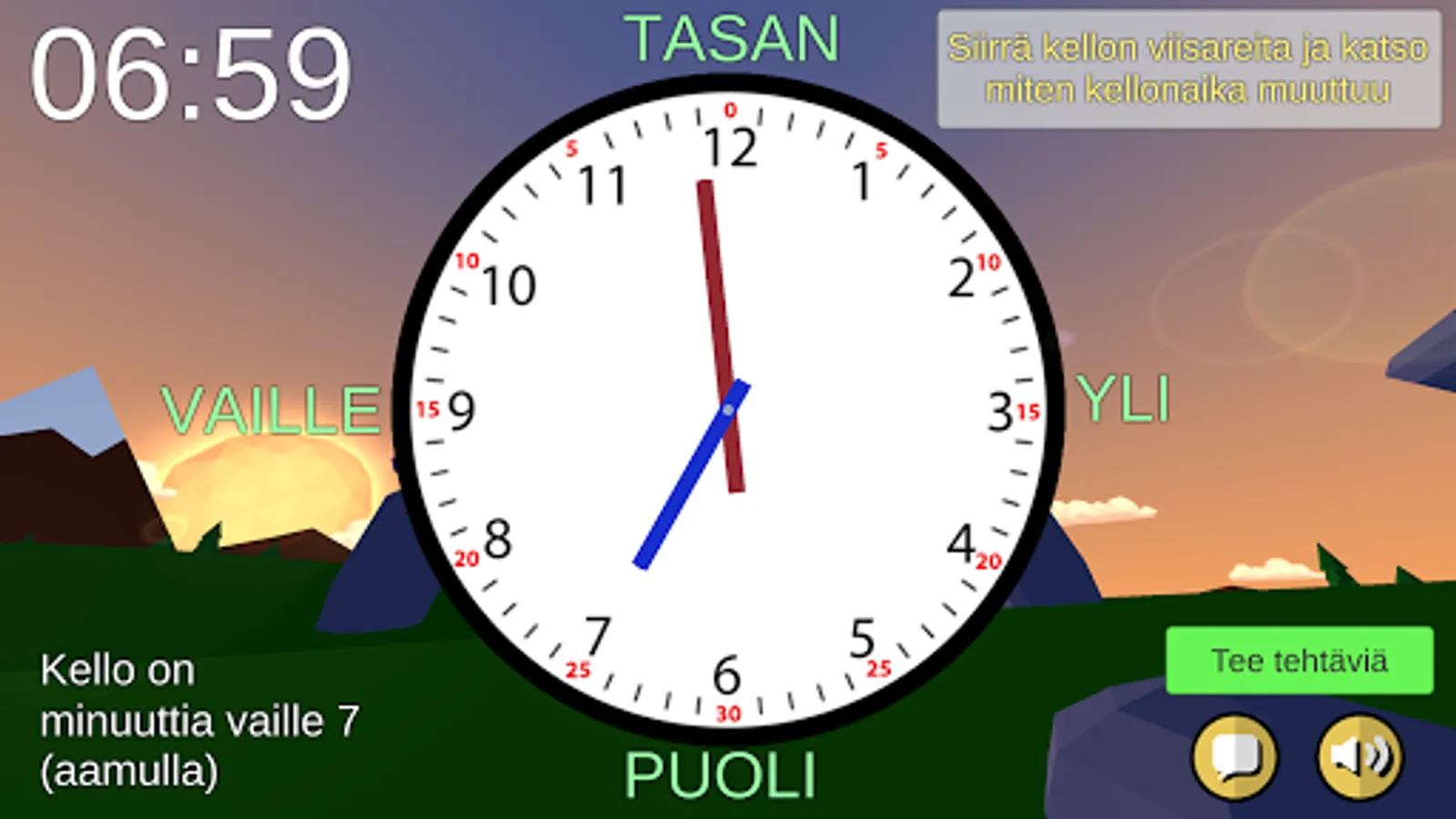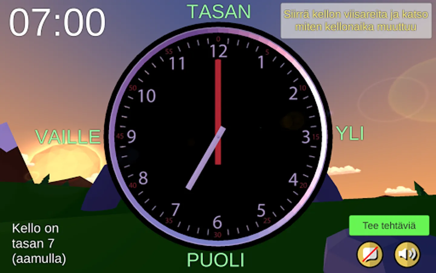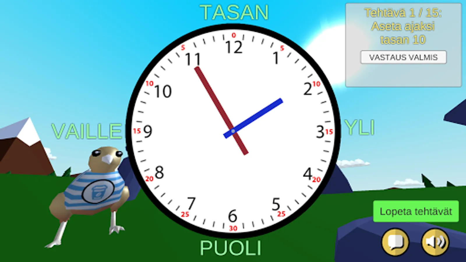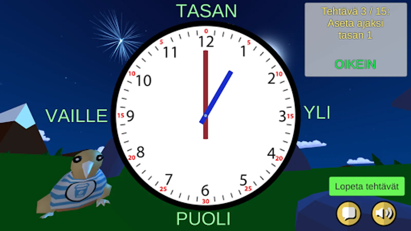 Voit myös tehdä tehtäviä, joissa kellon viisarit pitää asettaa määrättyyn aikaan. Oikeista vastauksista palkitaan ilotulituksella!