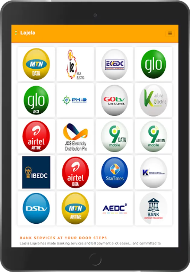 Lajela is a Mini banking system, online recharge and bill portal developed by Lajela Technologies (RC: 3111485) dully registered in providing creative and effective real time solutions in software development, We offer a multipurpose portal where users can open a valid NUBAN and subscribes for any desired services such as PHED, Ikeja electric, Eko electric, buy airtime and data bundle, print recharge card, buy Educational pin, from any of the telecoms services provider in Nigeria.