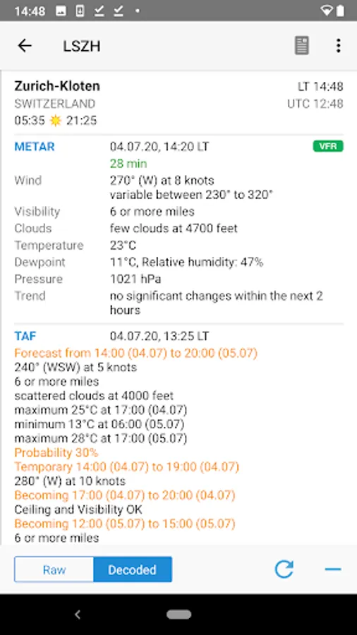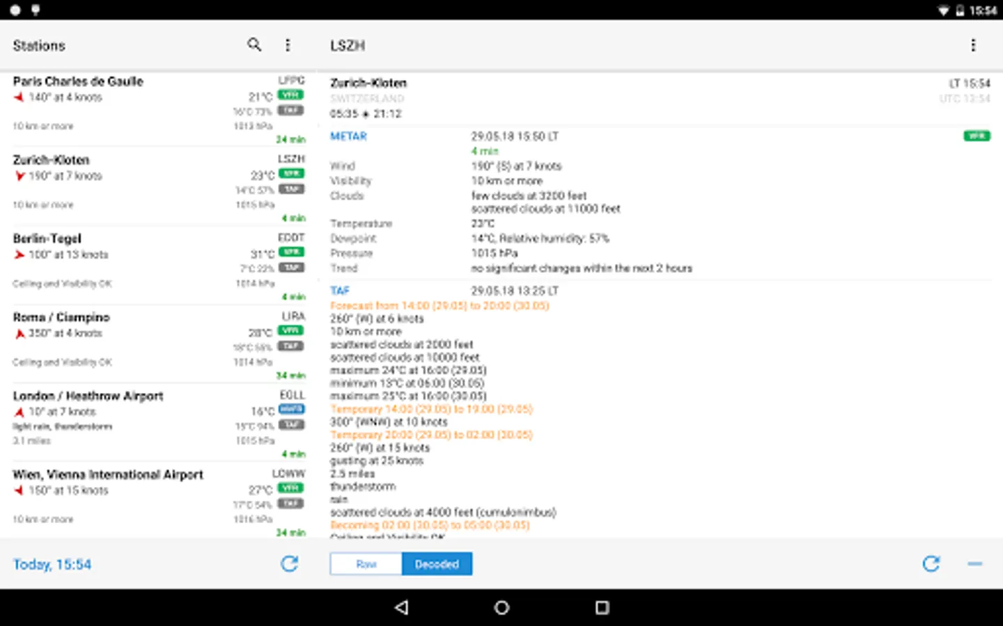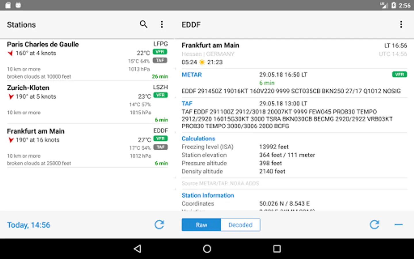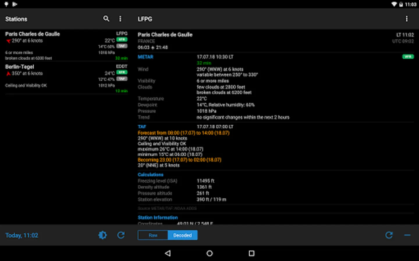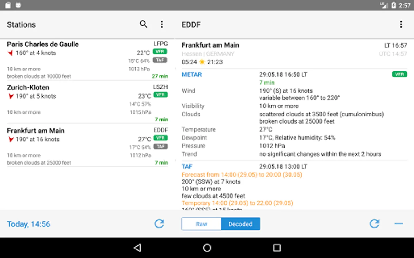 AeroWeather provides quick and intuitive access to METAR and TAF for airports worldwide. Data can be shown in its original (raw) format or as fully decoded and easy understandable texts. AeroWeather is helpful for weather preflight-briefings, but also to just get very precise weather. All weather data is cached for offline access. There are many settings for units and format of METAR/TAF available.