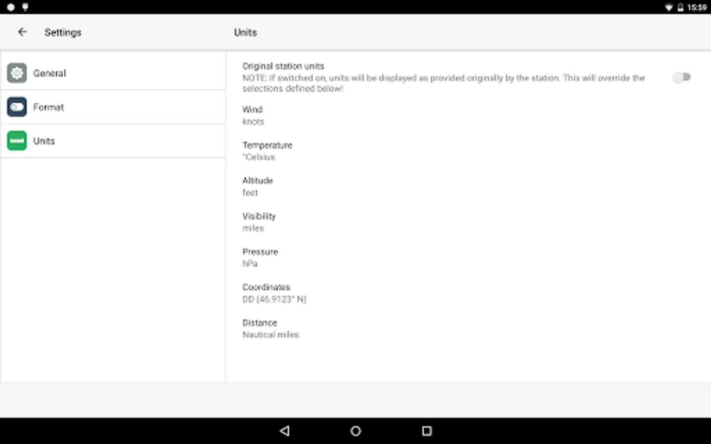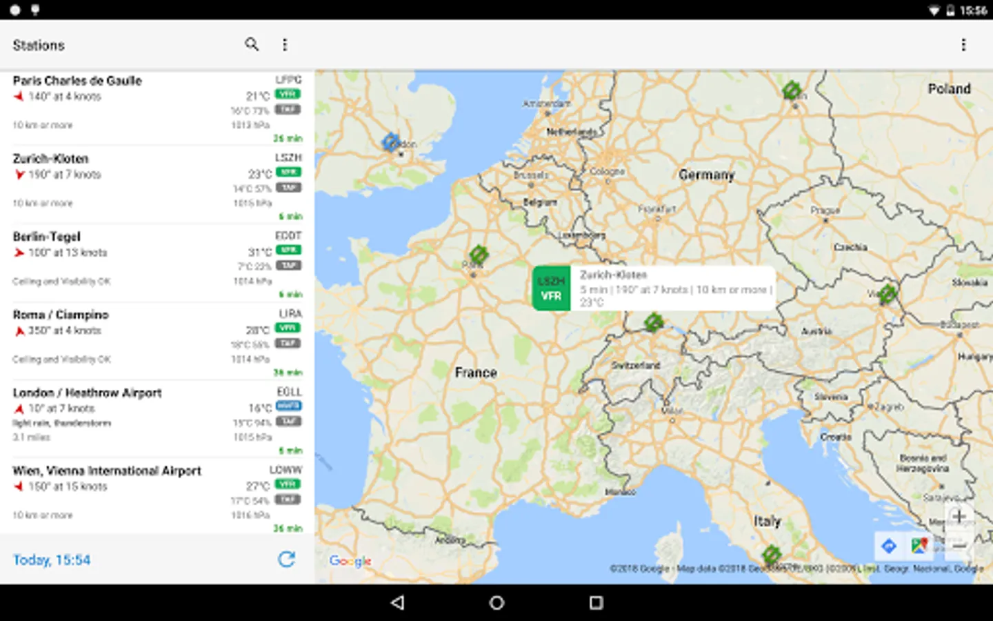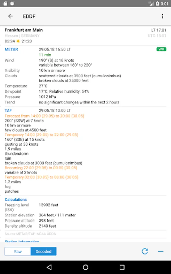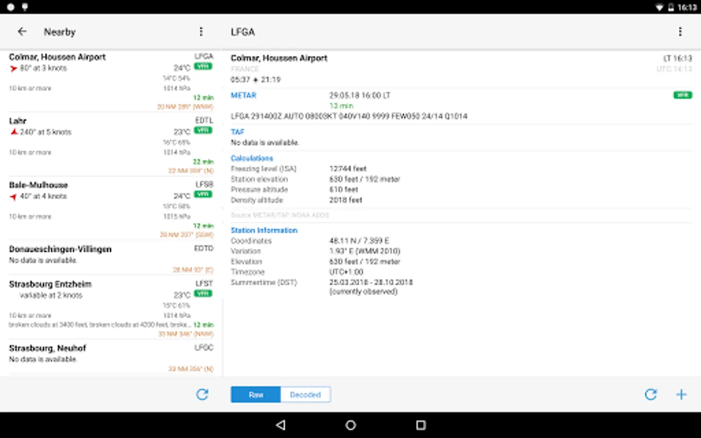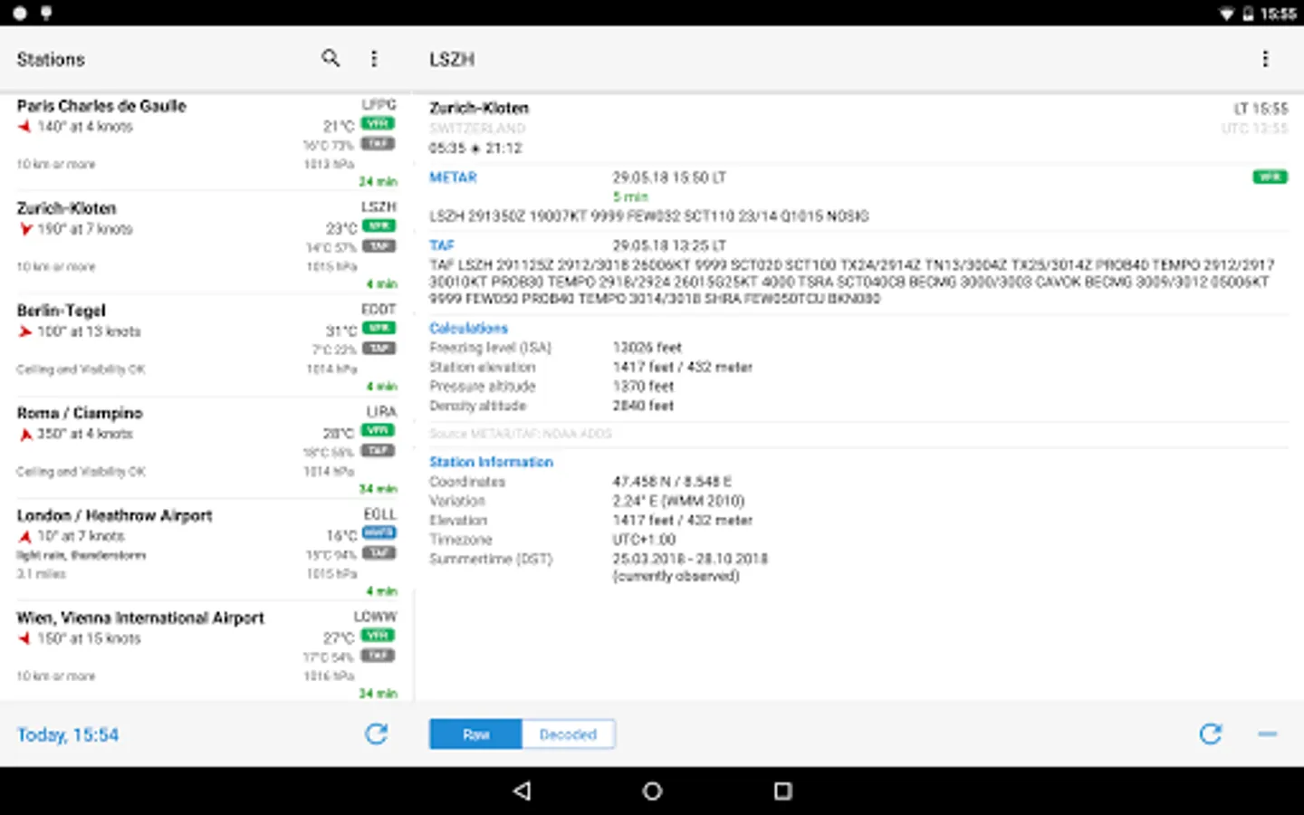 AeroWeather provides quick and intuitive access to METAR and TAF for airports worldwide. Data can be shown in its original (raw) format or as fully decoded and easy understandable texts. AeroWeather is helpful for weather preflight-briefings, but also to just get very precise weather. All weather data is cached for offline access. There are many settings for units and format of METAR/TAF available.