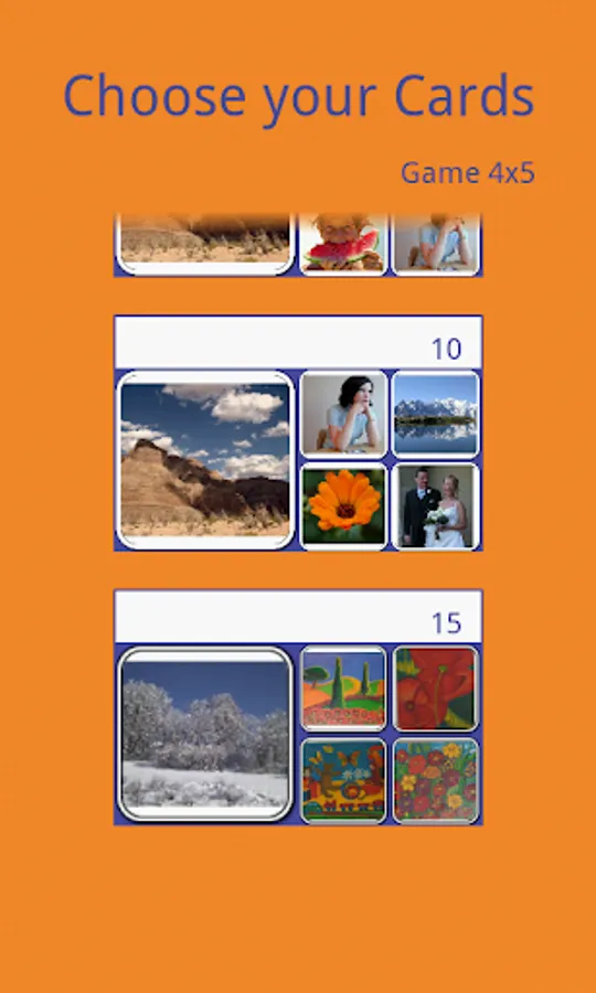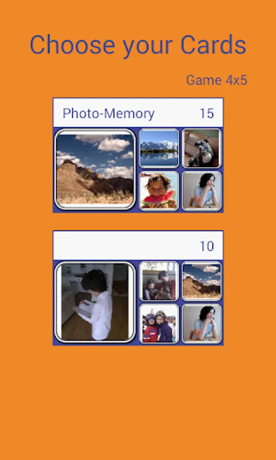 "Photo-Memory" allows you to make cards for a game of memory with your personal photographs. Browsing your image gallery you can add pictures to the game at the touch of a button.