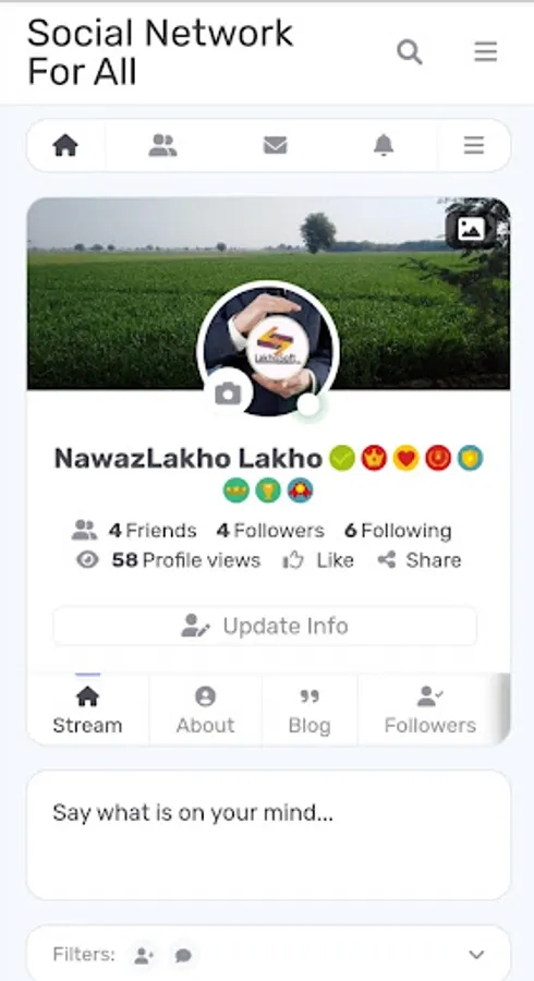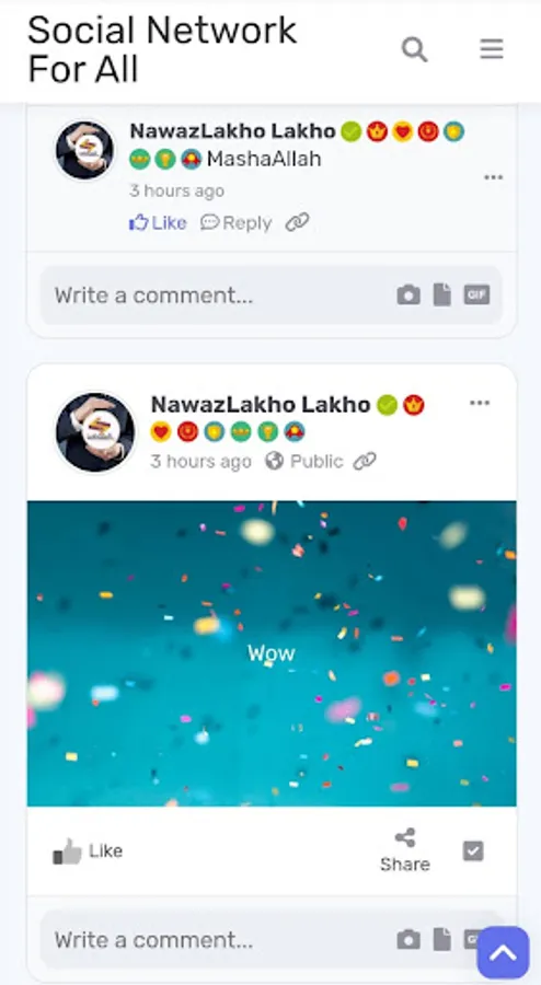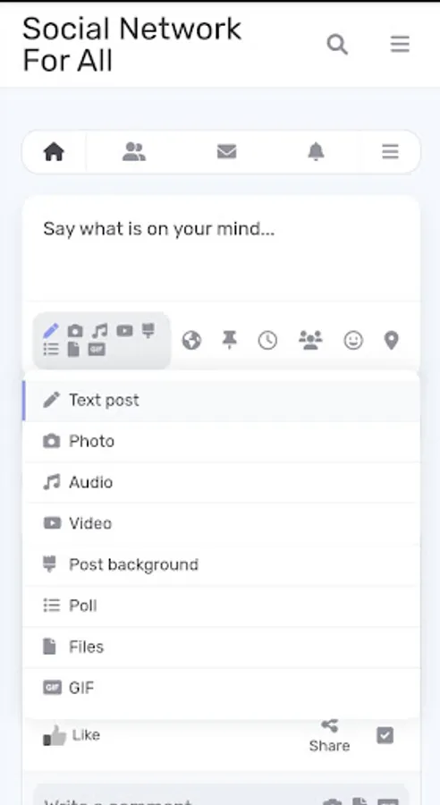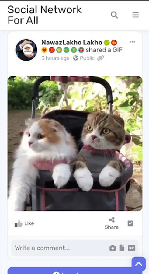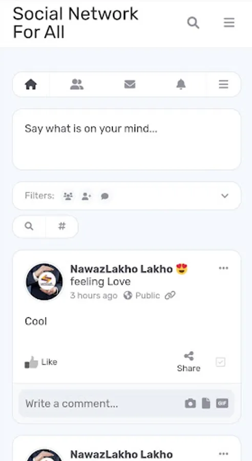 Social network is for all and after registration, user can start sharing photos, videos, audios, document, text and more. User can share there feelings using emojis. Share their mood in the post with approximate location. User can hide their status and data.
