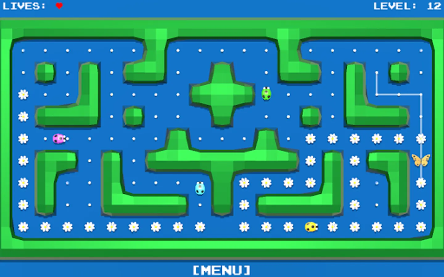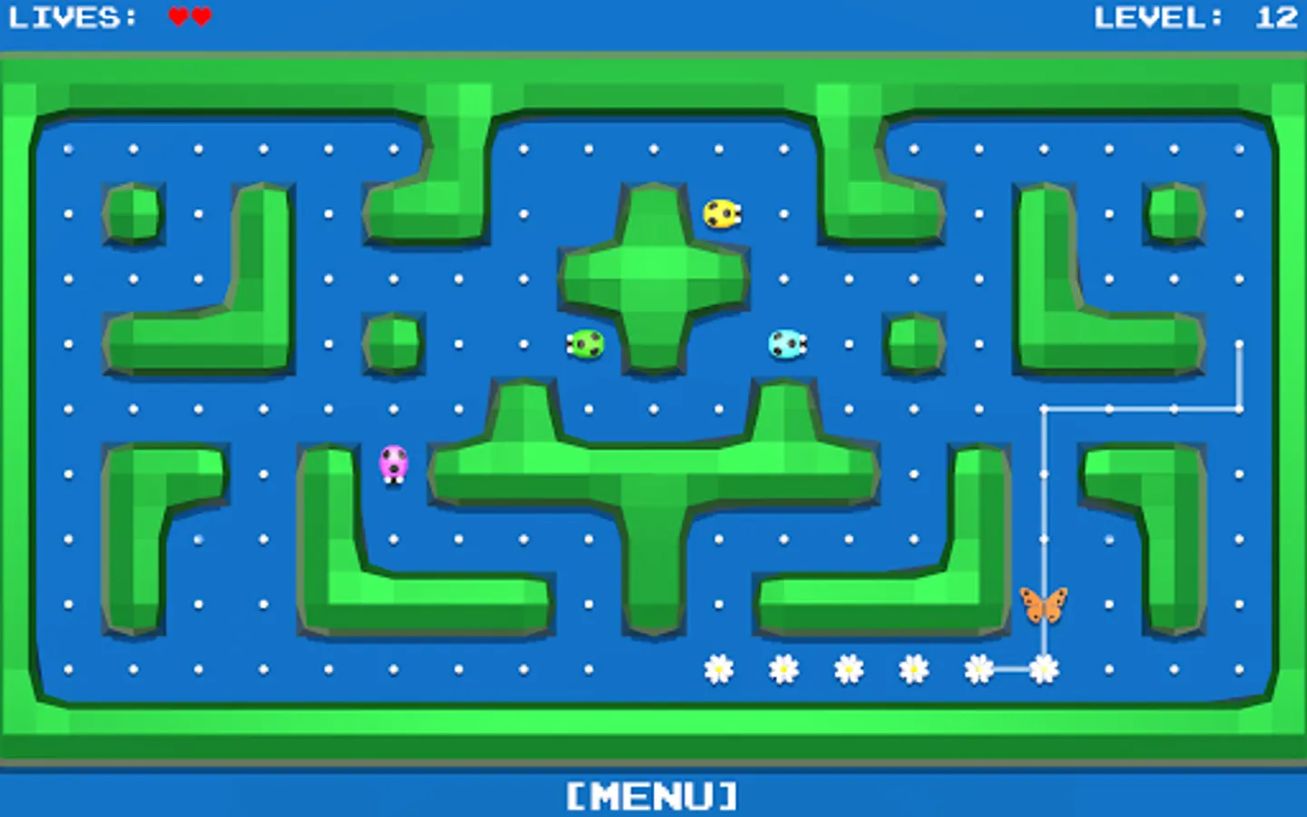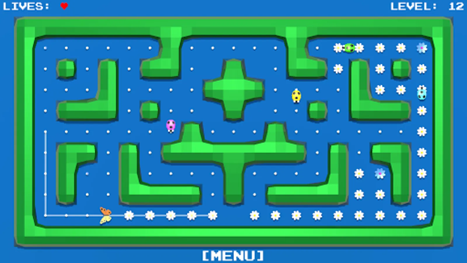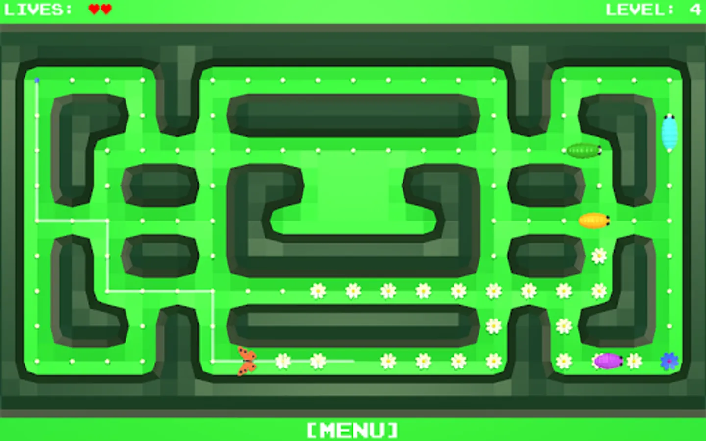 All the flowers in the meadow should blossom. You control the butterfly, which you routeing to the unblown flowers.