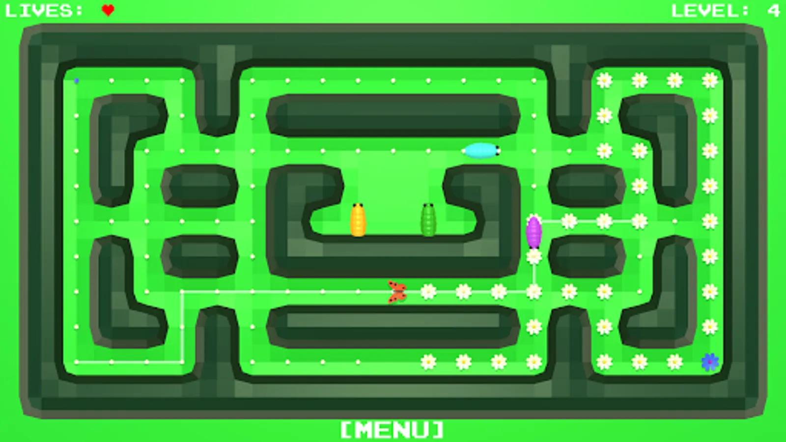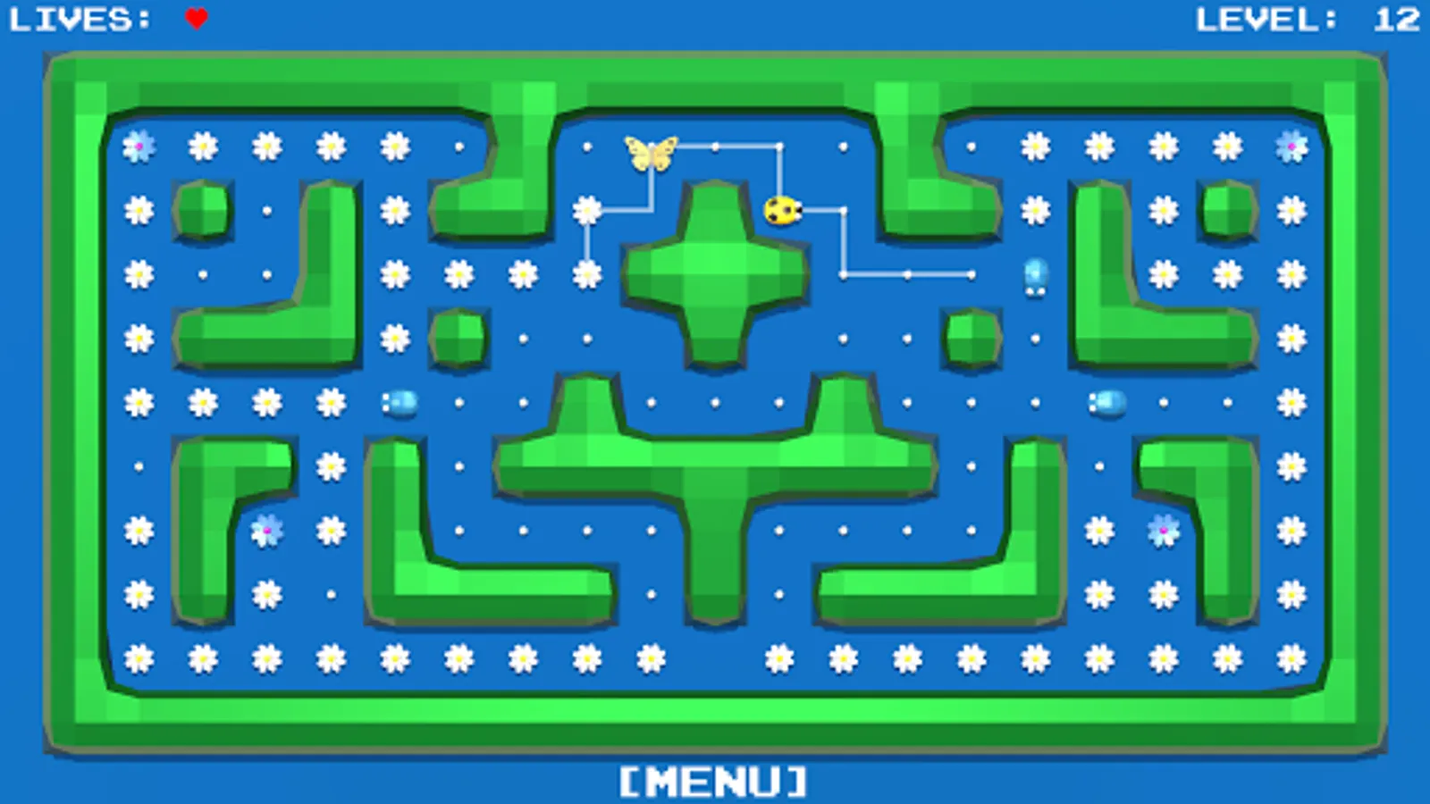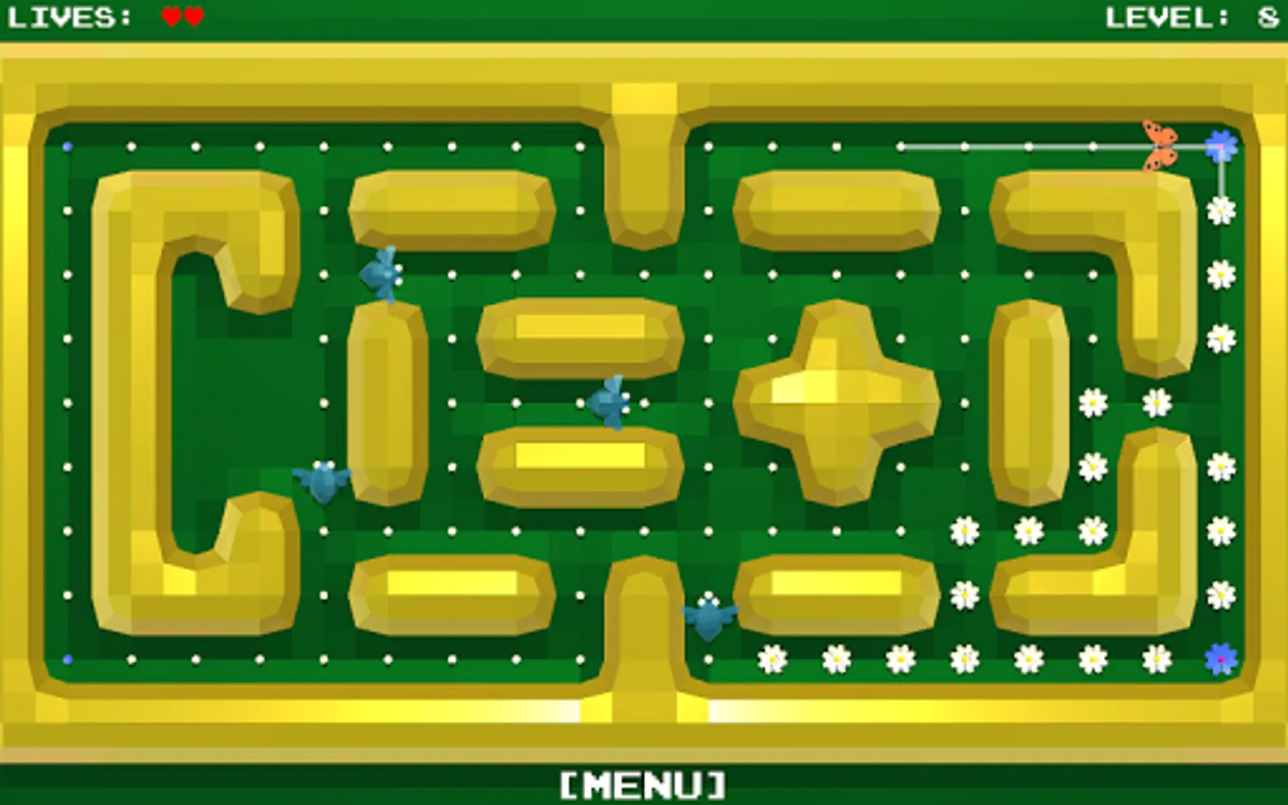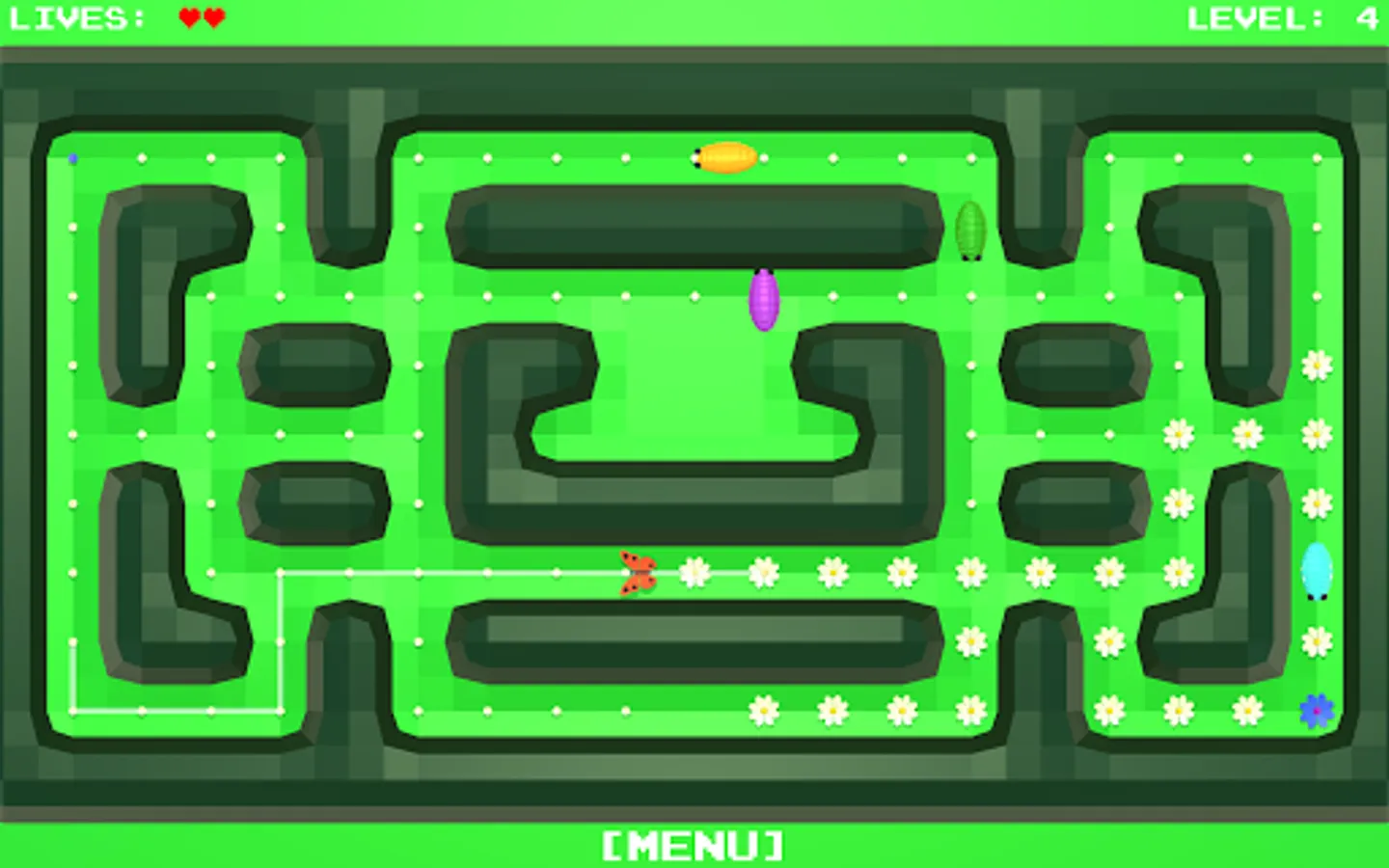 All the flowers in the meadow should blossom. You control the butterfly, which you routeing to the unblown flowers.