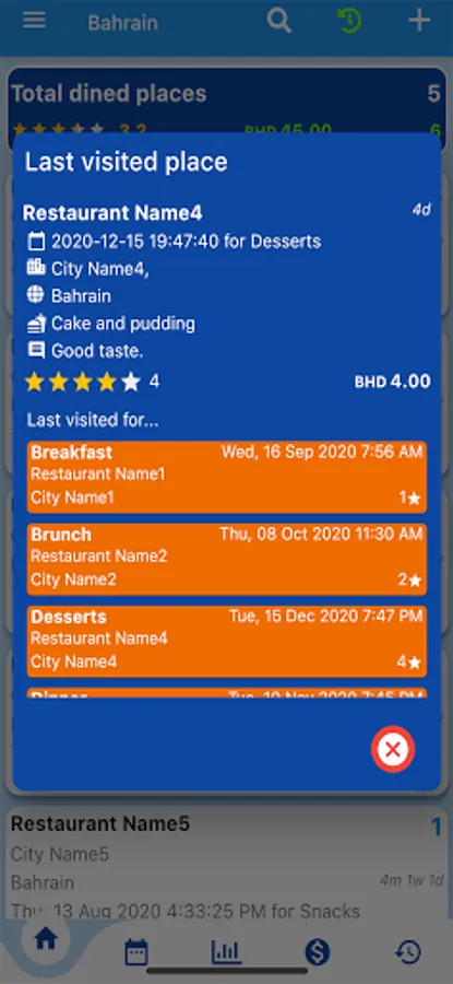With Dinedplaces, you can keep a log of all restaurants that you have visited recently or in the past. You can list what you've had, comment and rate your experience. You can easily filter your views based on spending patterns, cities/towns, meal types, etc...