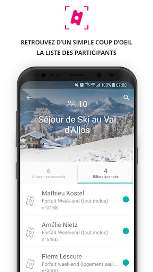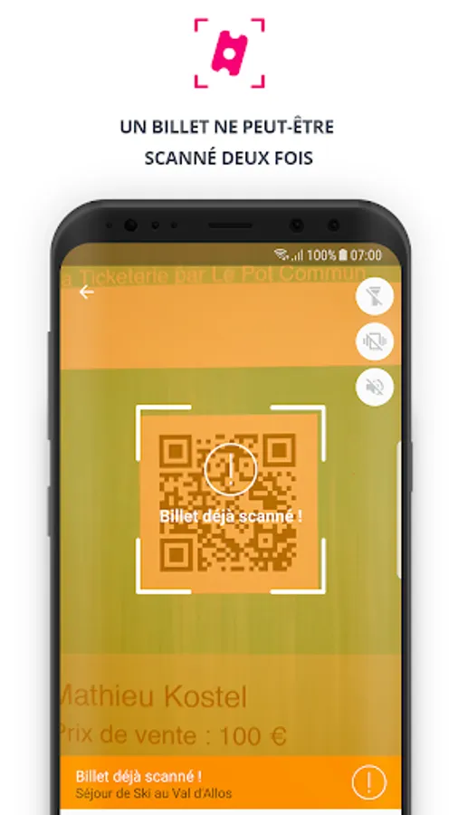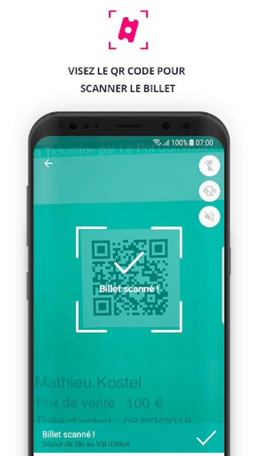 - Scan the QR Code of the ticket to be controlled with the camera integrated in ScanEvent