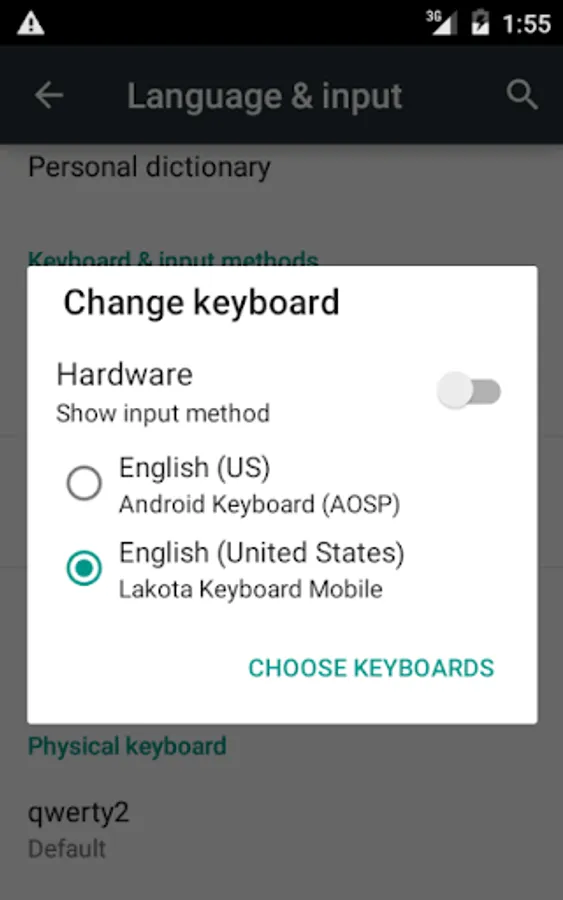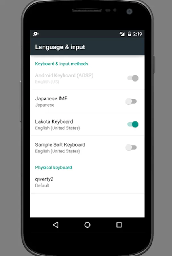 Lakota Keyboard - Mobile is the Setting app that let's you type correct Lakota into any text area on your mobile device by simply switching into the Lakota Keyboard Mobile option in the KEYBOARD & INPUTS METHODS section of the LANGUAGE & INPUT area of the SETTINGS.