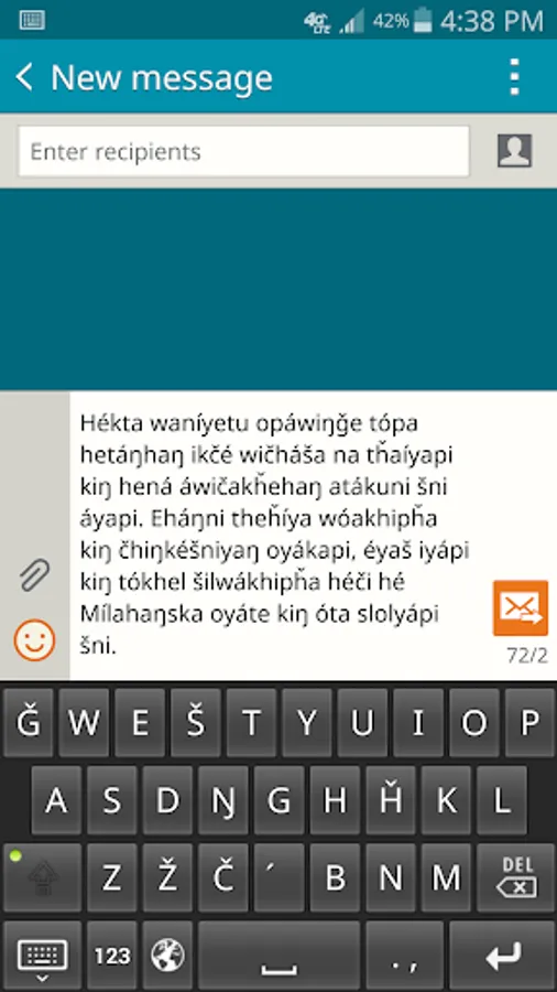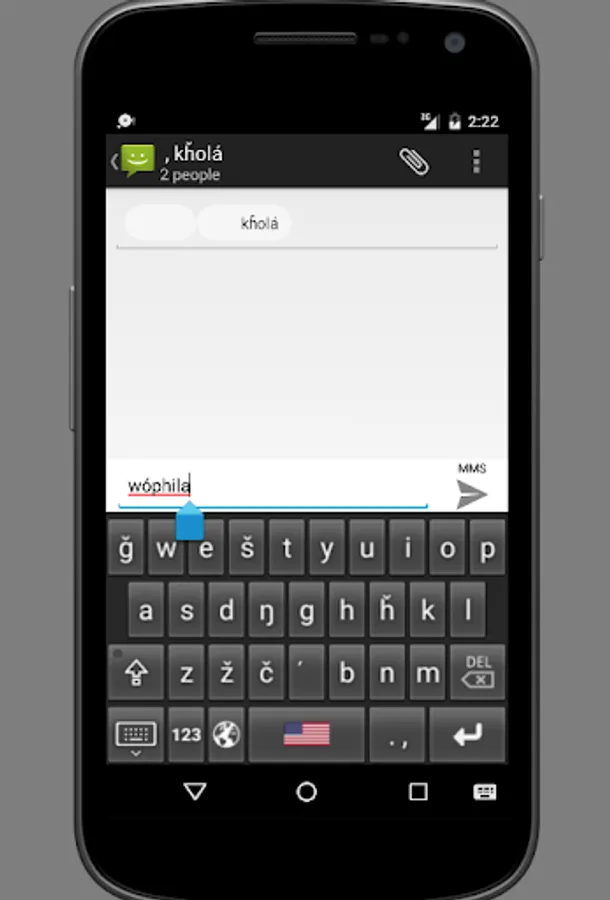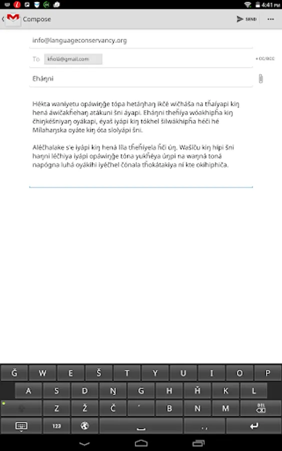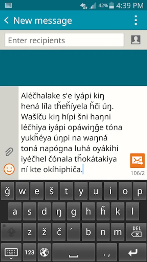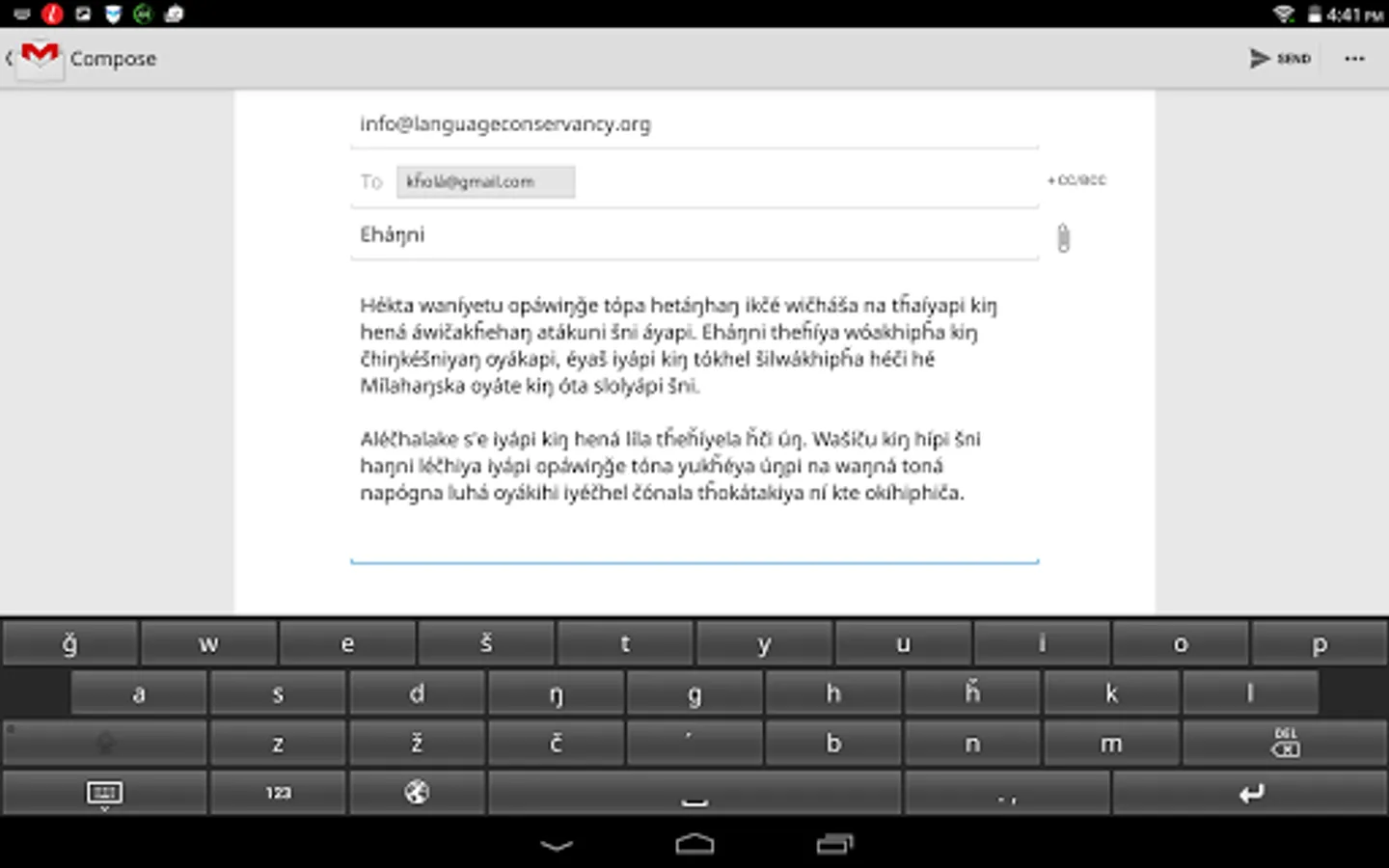 Once installed and selected as a keyboard option, you can switch between Lakota and English as you type emails, SMS, MMS, web content, and any other text-input field. Just click the 'globe'