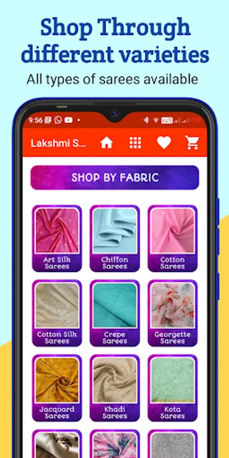 This app includes all saree types including fabric material, embroidery work, party wear, casual and many more