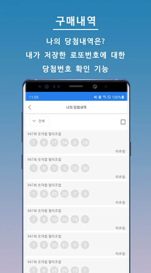 You can set the winning number as you want, draw 5 times, draw 10 times, receive the number and check the winning details through simulation. You can realistically check the information on how many times I will spend 1 million won and how many times I will win to become the first place..