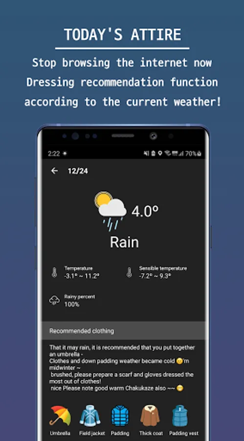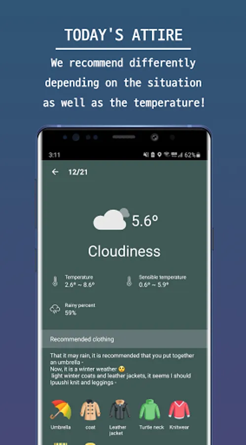 Did you always check the weather before going to work or school?? You don't have to. We will tell you what clothes will be cool and warm depending on the current weather. Coordinate to your heart's content and look great!