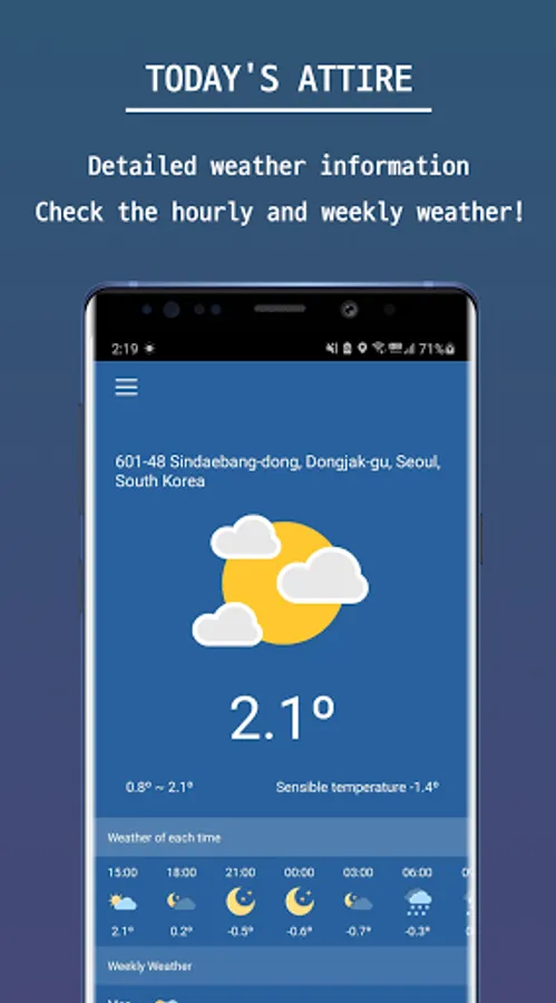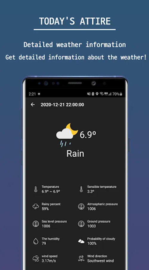 Through various data such as temperature, perceived temperature, probability of precipitation, atmospheric pressure, humidity, and wind speed, you can check information about the weather at a glance.