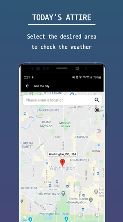 In addition to your current location, you can add cities through the map to check the weather in other regions.