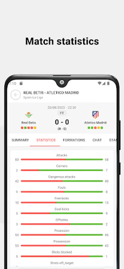 You can follow the La Liga match details, the formation of the match, the actions in the match, the last matches played by the 2 teams, the match statistics, the players and the line-up of the field.