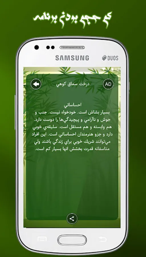 In this tree horoscope and astrology program: I have prepared the real future horoscope for you friends, based on your date of birth (or anyone else you want to know more about), choose the desired tree and find it in the list and Observe your moral qualities. Dear friends, this horoscope and tree astrology: the real future horoscope can be shared on social networks.