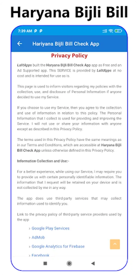 This (Haryana Bijli Bill Check App) is not an official app. This App contains third party web links of some official websites of Haryana where you can check your home or office electricity bill online in your mobile. All the web links available in this app are belongs to their respective owners only. It is hereby strongly disclaimed that we shall under no circumstance be liable for any failure to check or view your Electricity Bill in this app because this is not an official app.