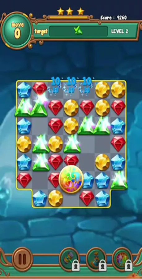 - Every match from 3 jewels you will accumulate energy for mighty bomb, that helps to destroy obstacles for you.
